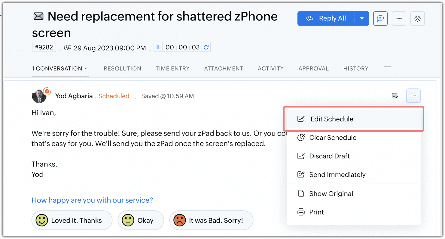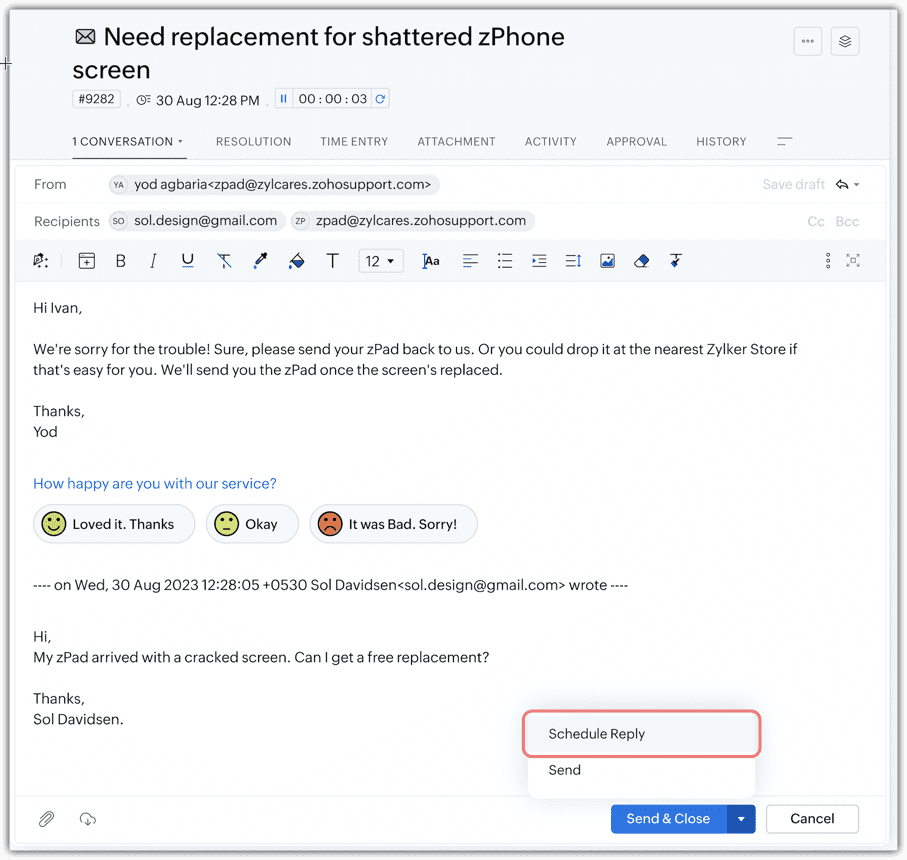 客户支持团队在不同的时区工作,他们可能会发现在工作时间内回复所有支持工单是一项挑战。 有时,他们可能会无意中在错误的时间发送电子邮件。 通过设定发送邮件的日期和时间,这种情况会很容易避免。