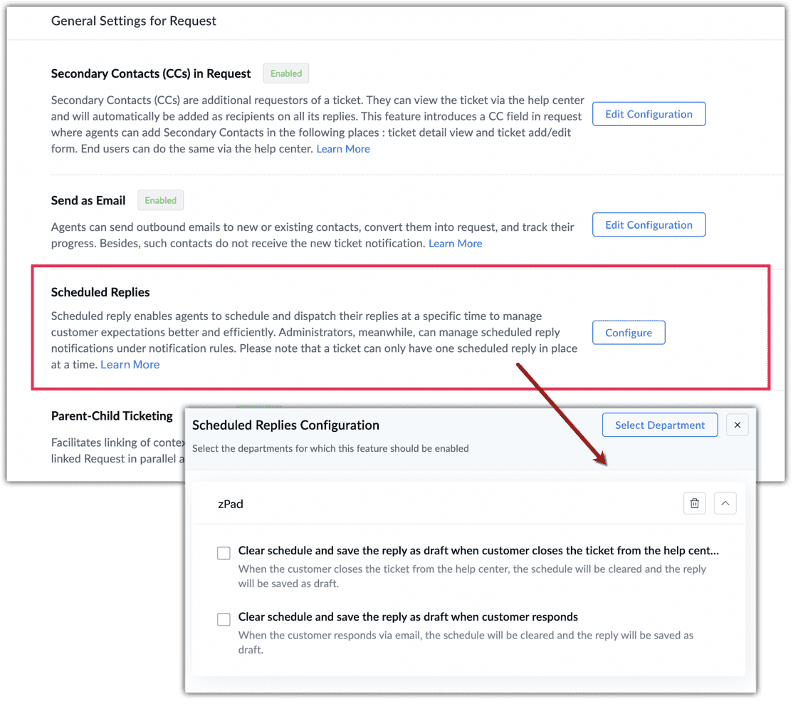 具有管理员权限的用户可以为其访问的部门启用或禁用计划回复。