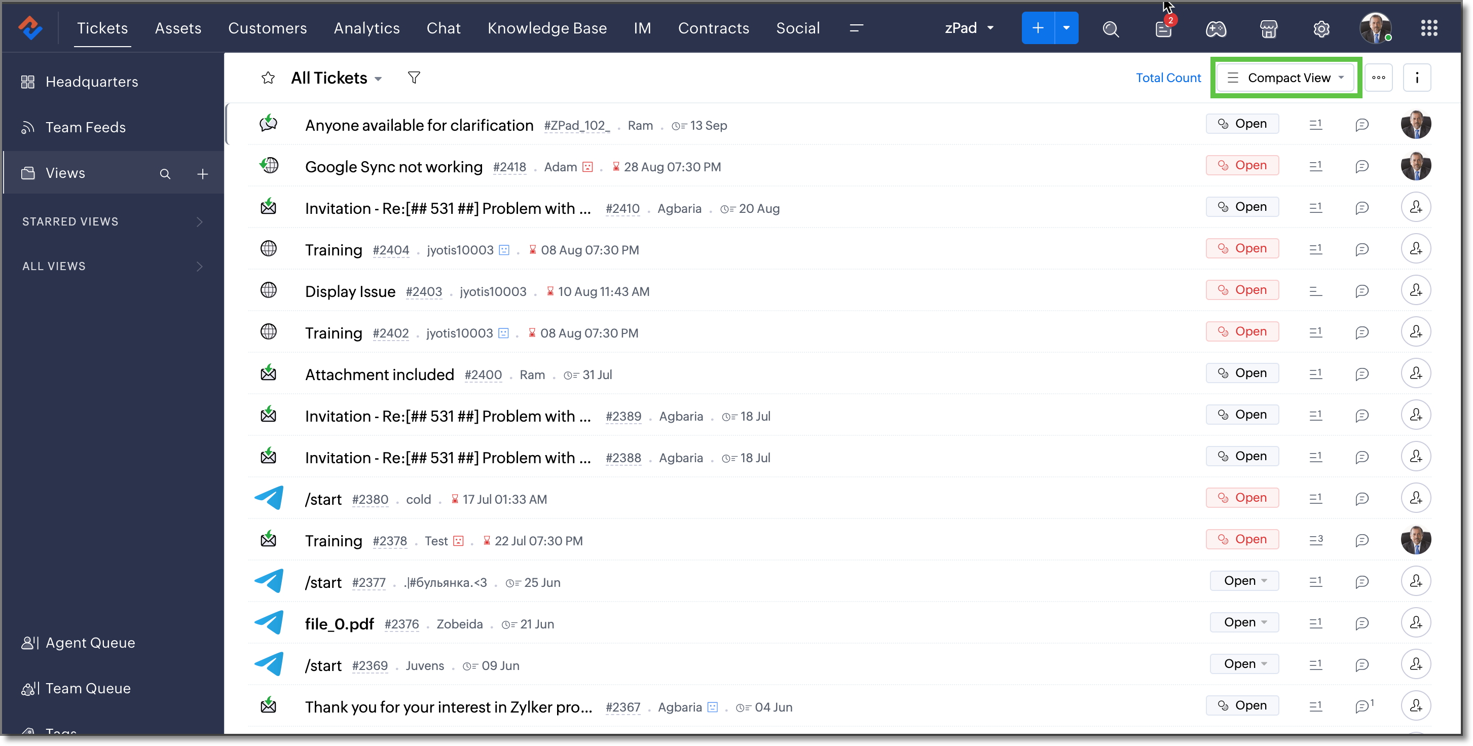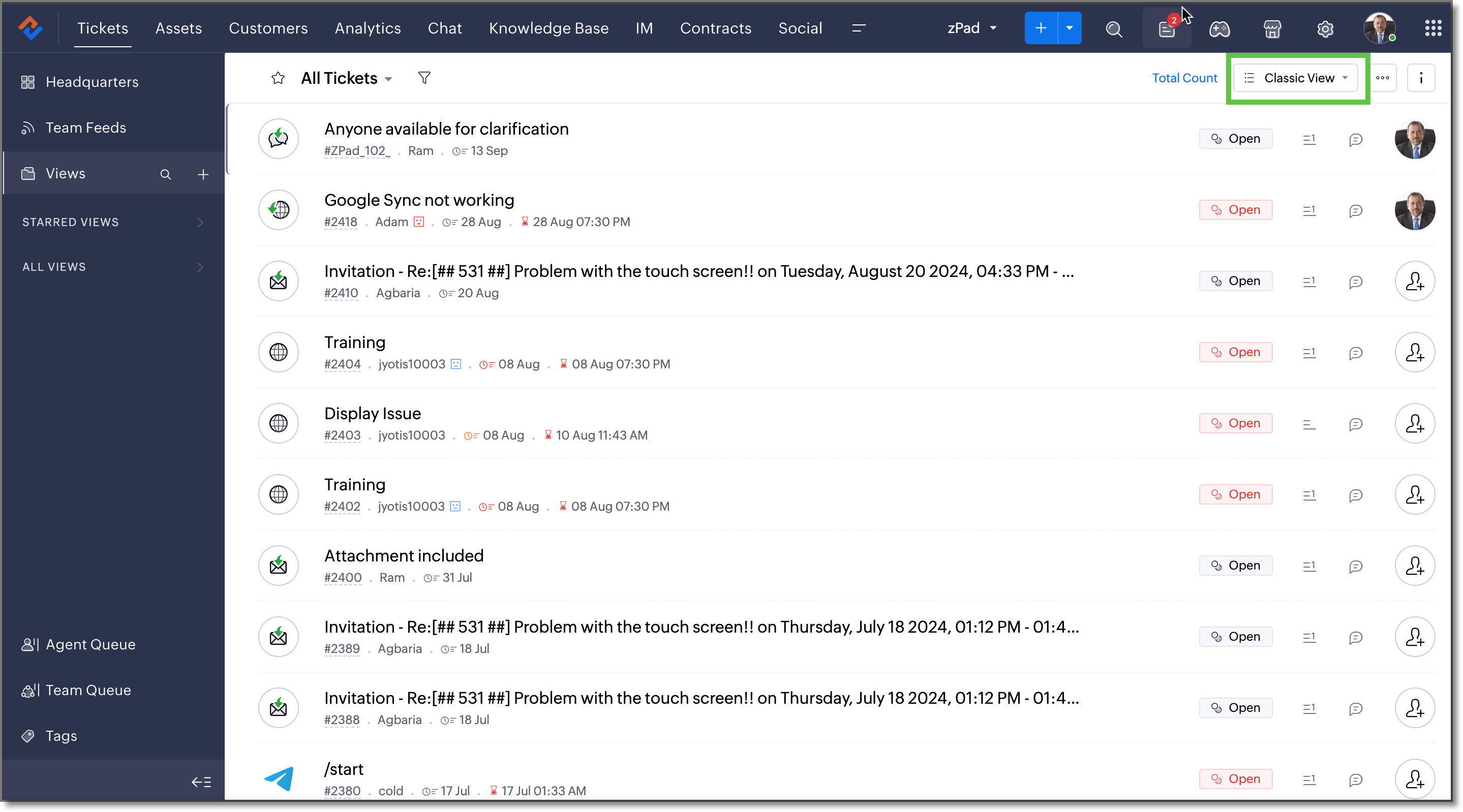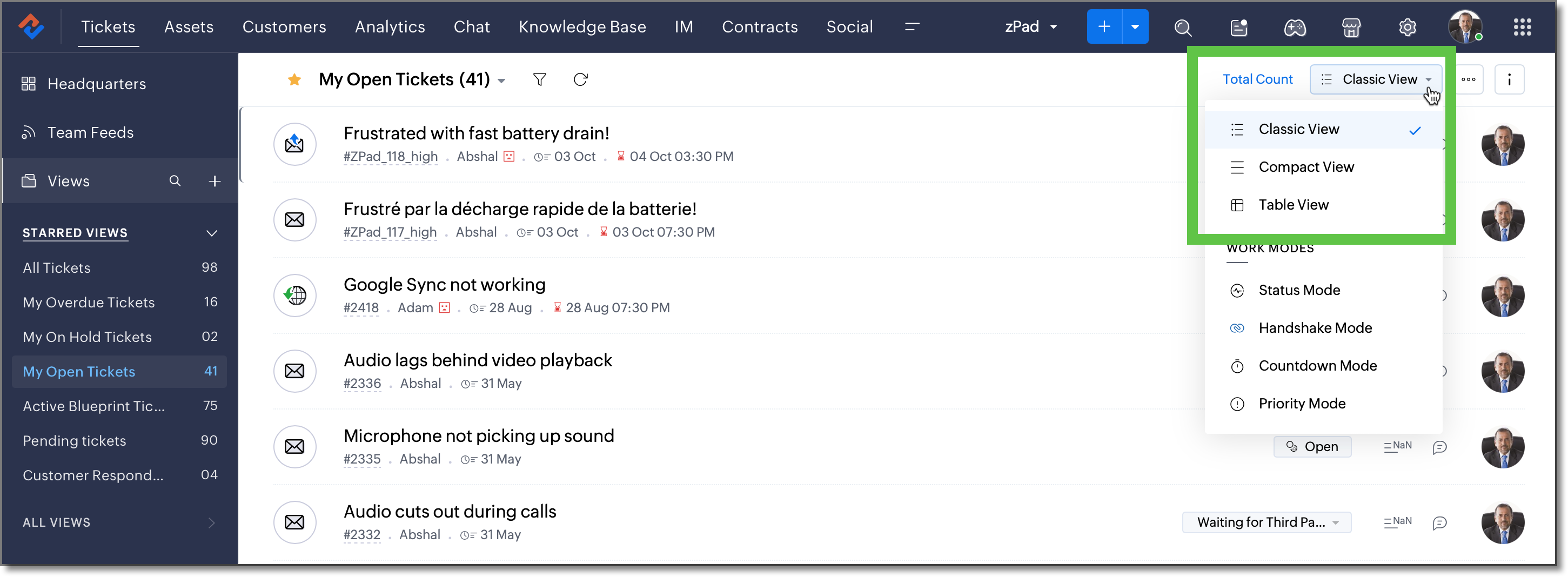 由于技术支持团队每天需要处理大量工单,客服人员可以利用以下工单视图选项来提高访问性。它提供了三种不同的方式,让客服人员可以查看所有工单: