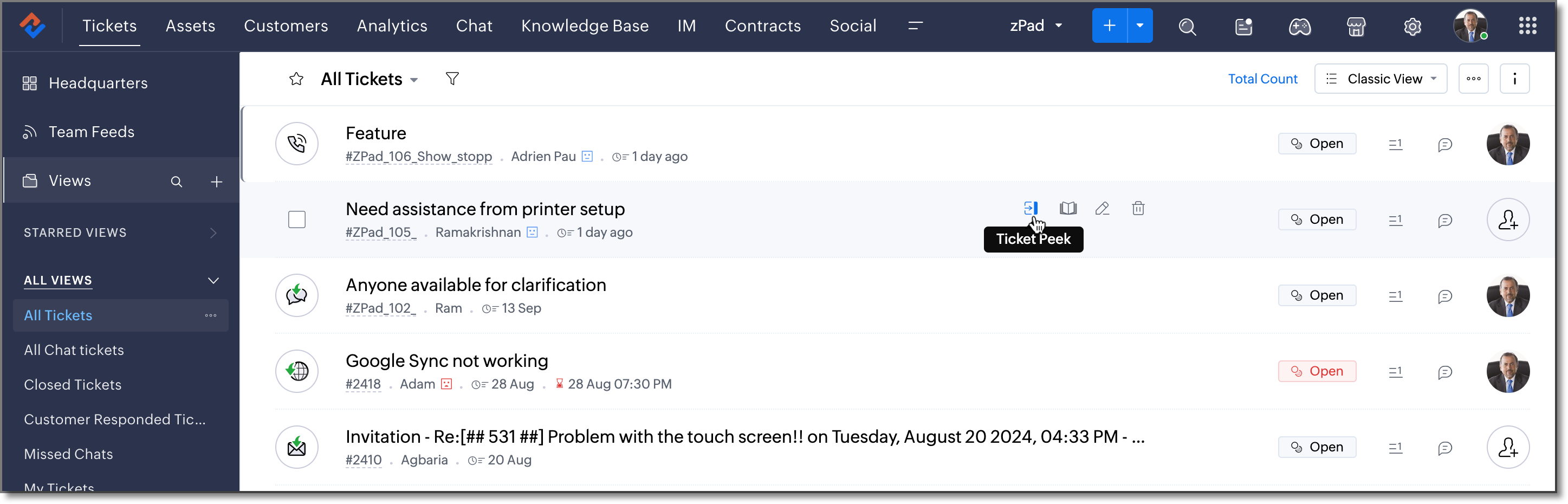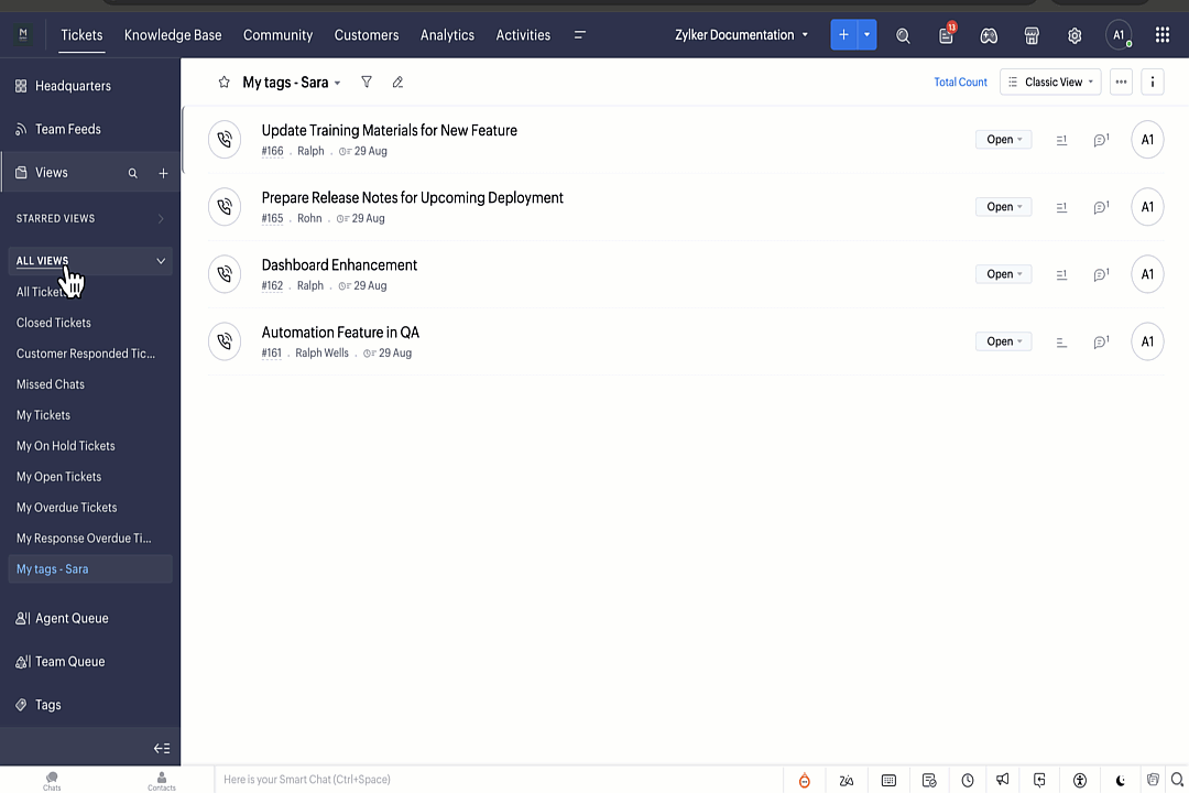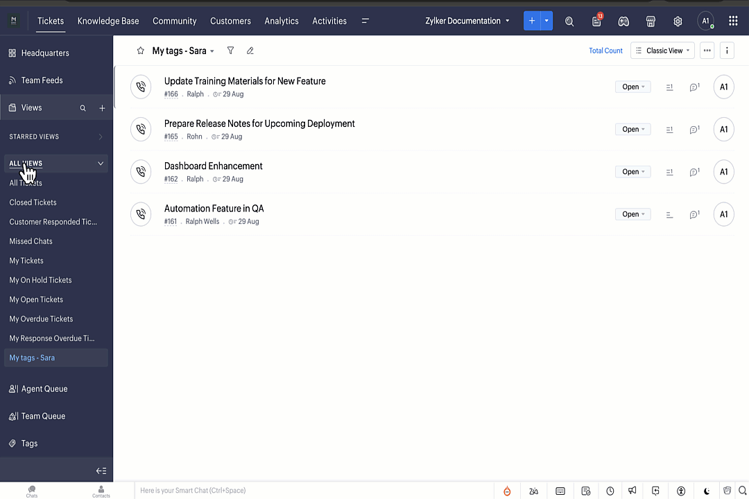 由于技术支持团队每天需要处理大量工单,客服人员可以利用以下工单视图选项来提高访问性。它提供了三种不同的方式,让客服人员可以查看所有工单: