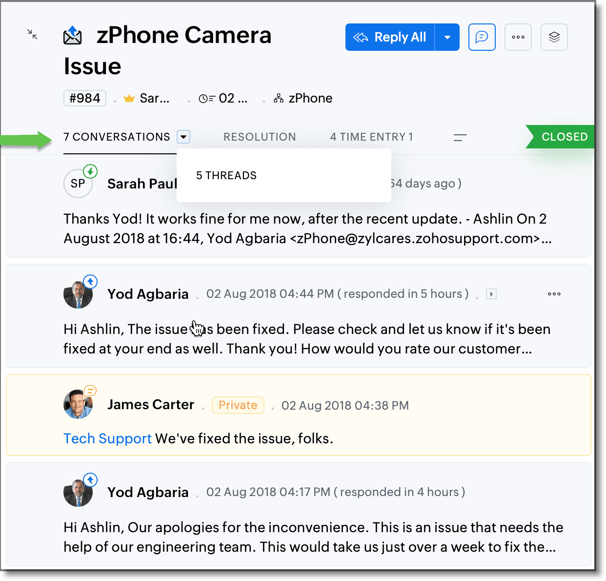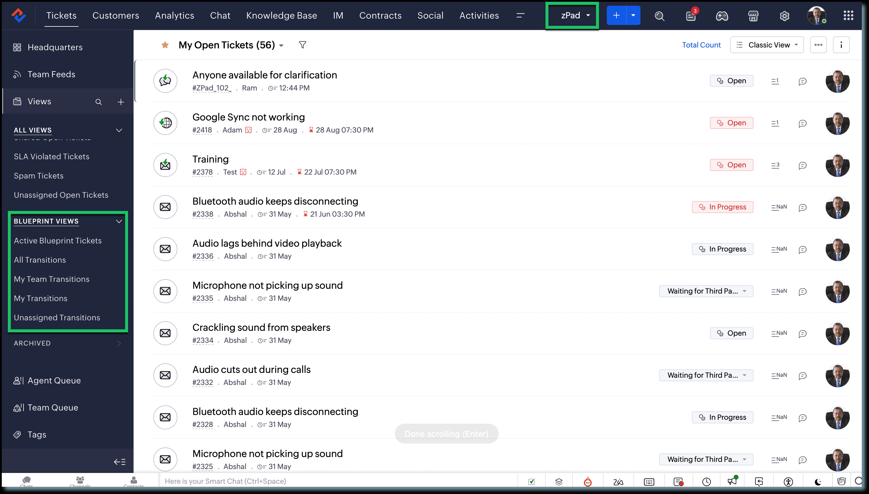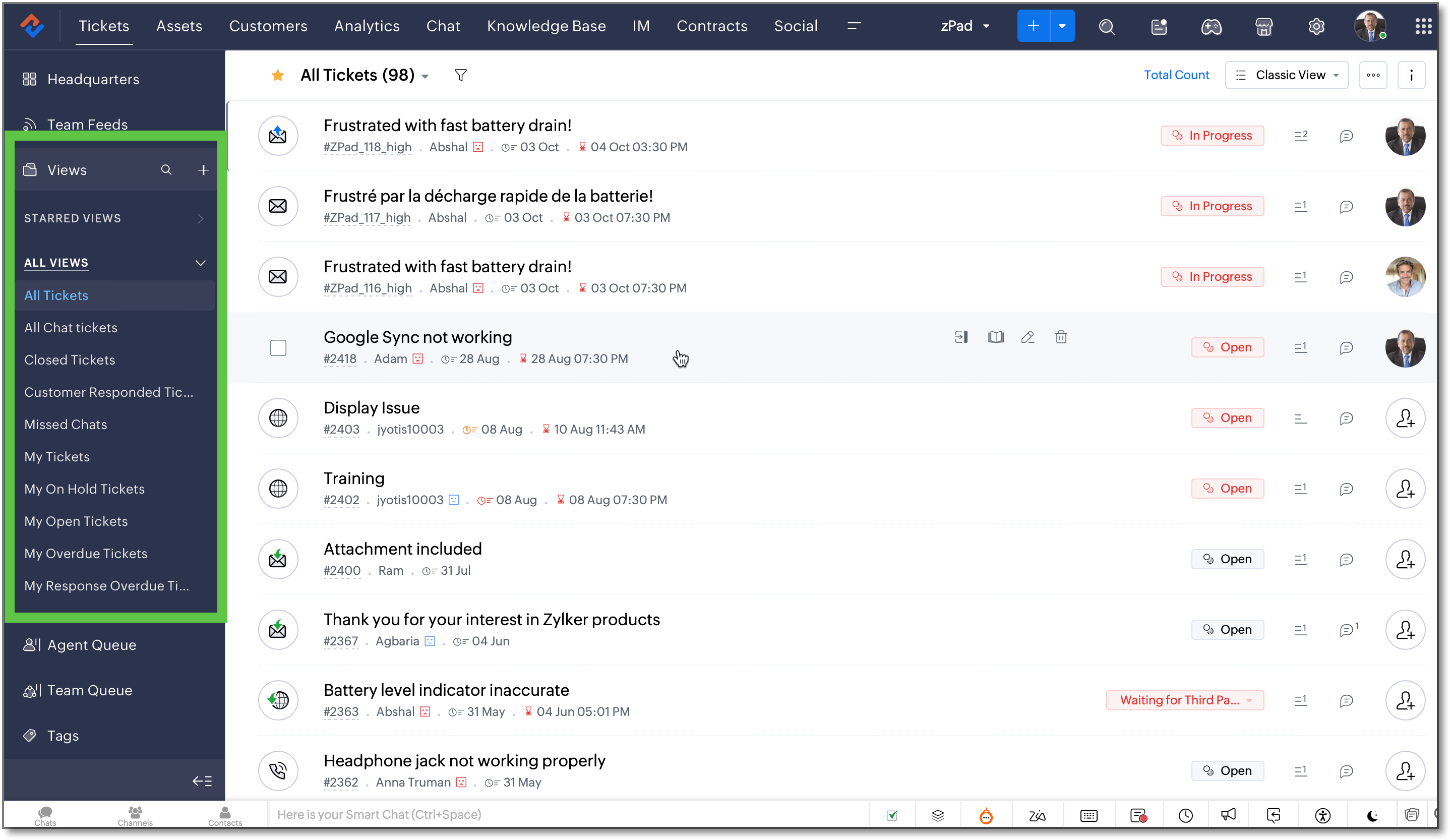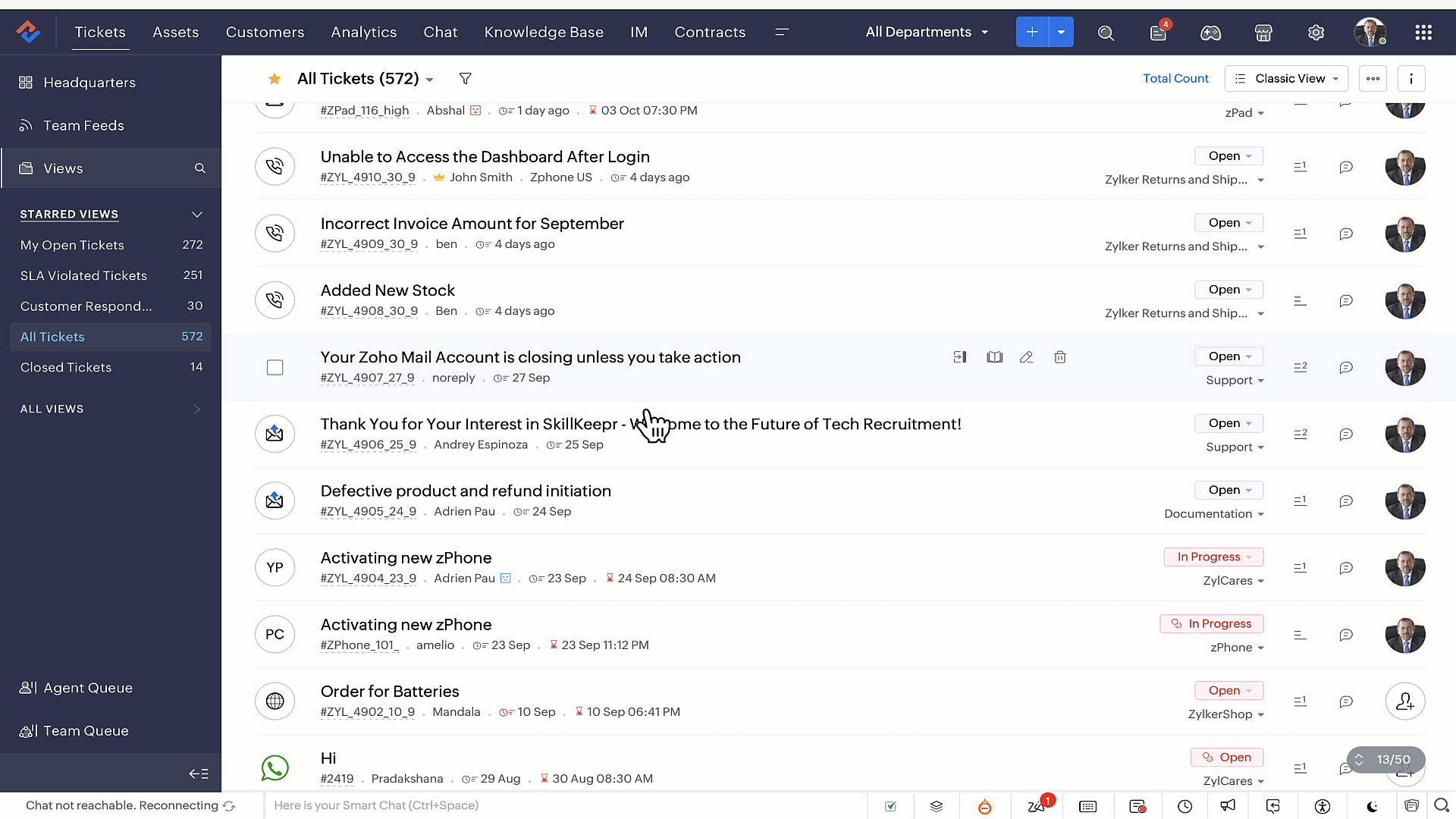 它会显示所有关键信息,如主题、客户、详情、状态等。可在所有部门视图和特定部门视图中查看。