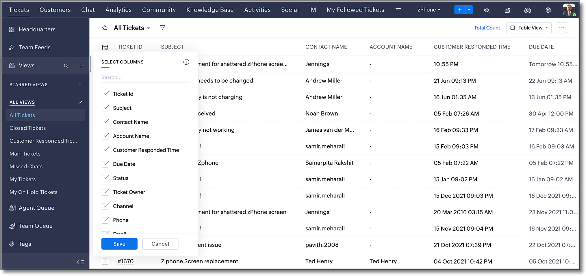 此定制提供了在表格视图中添加、删除和排序列顺序的灵活性。可以自定义列,仅查看对客服人员至关重要的字段。