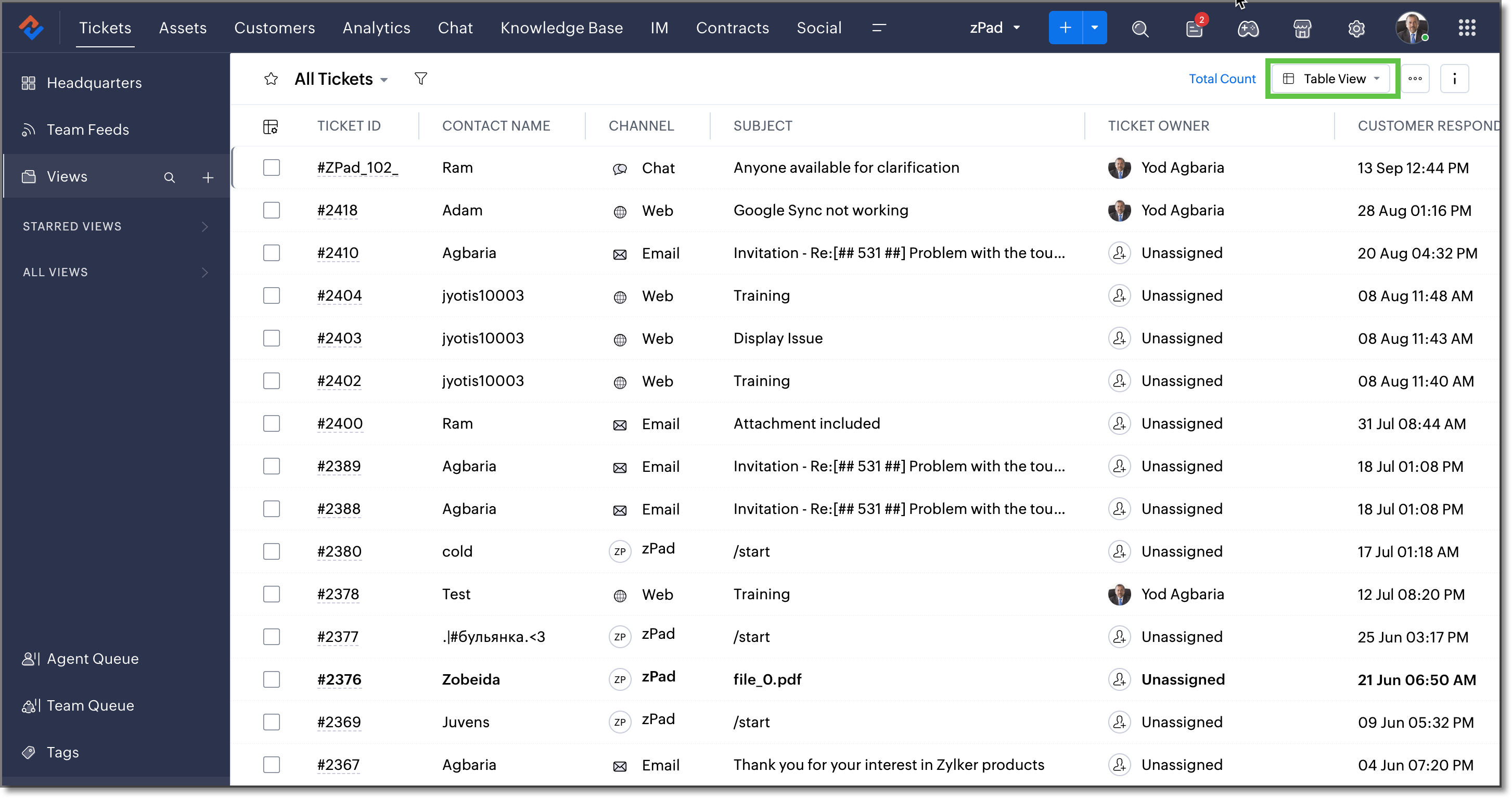 表格视图以行和列的形式显示工单,类似于电子表格。每一行显示一个工单,每一列显示工单的属性,例如响应截止日期、联系人姓名和主题。这使得客服人员可以在不打开工单详情页的情况下查看工单属性。表格视图是针对特定部门的视图。