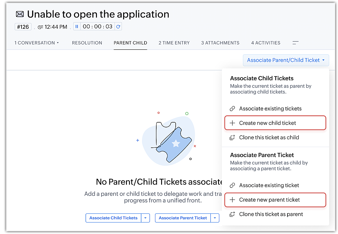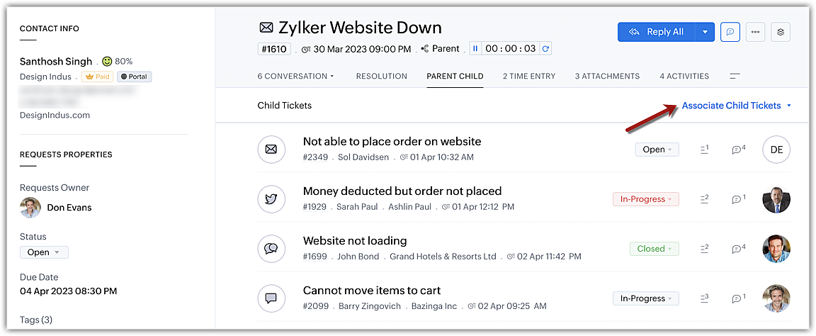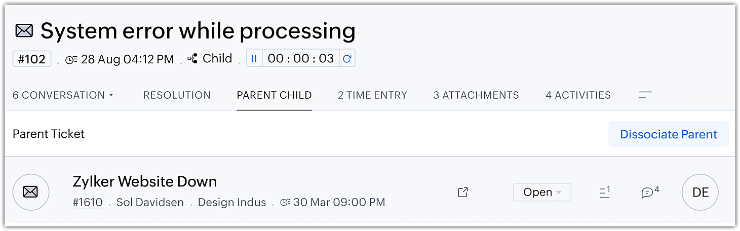 Zoho Desk促进父-子工单关系。 它提供了一个选项,可以选择一个工单作为父工单,并将一个类似的工单作为子工单关联到它。