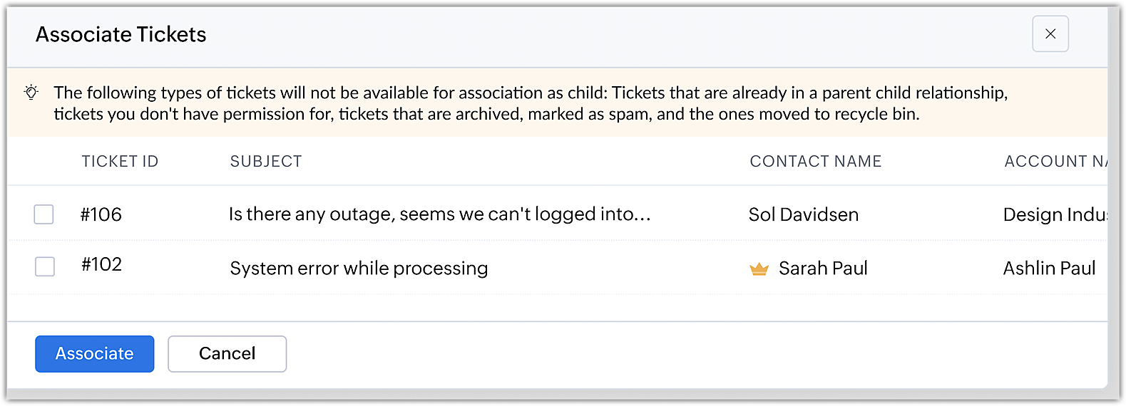 - 已经作为父或子工单相关联的。您可以取消关联后,将它们与另一个工单相关联。