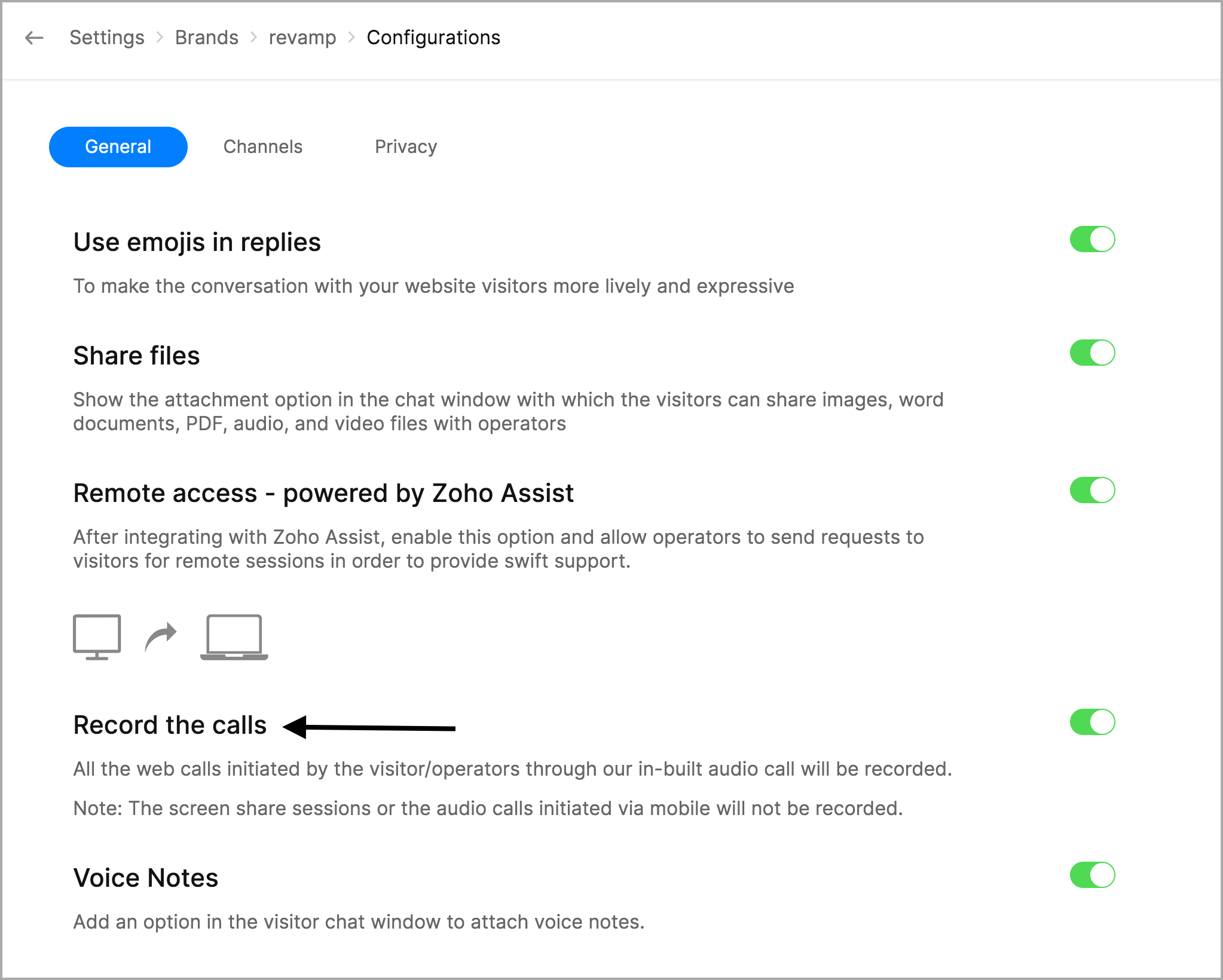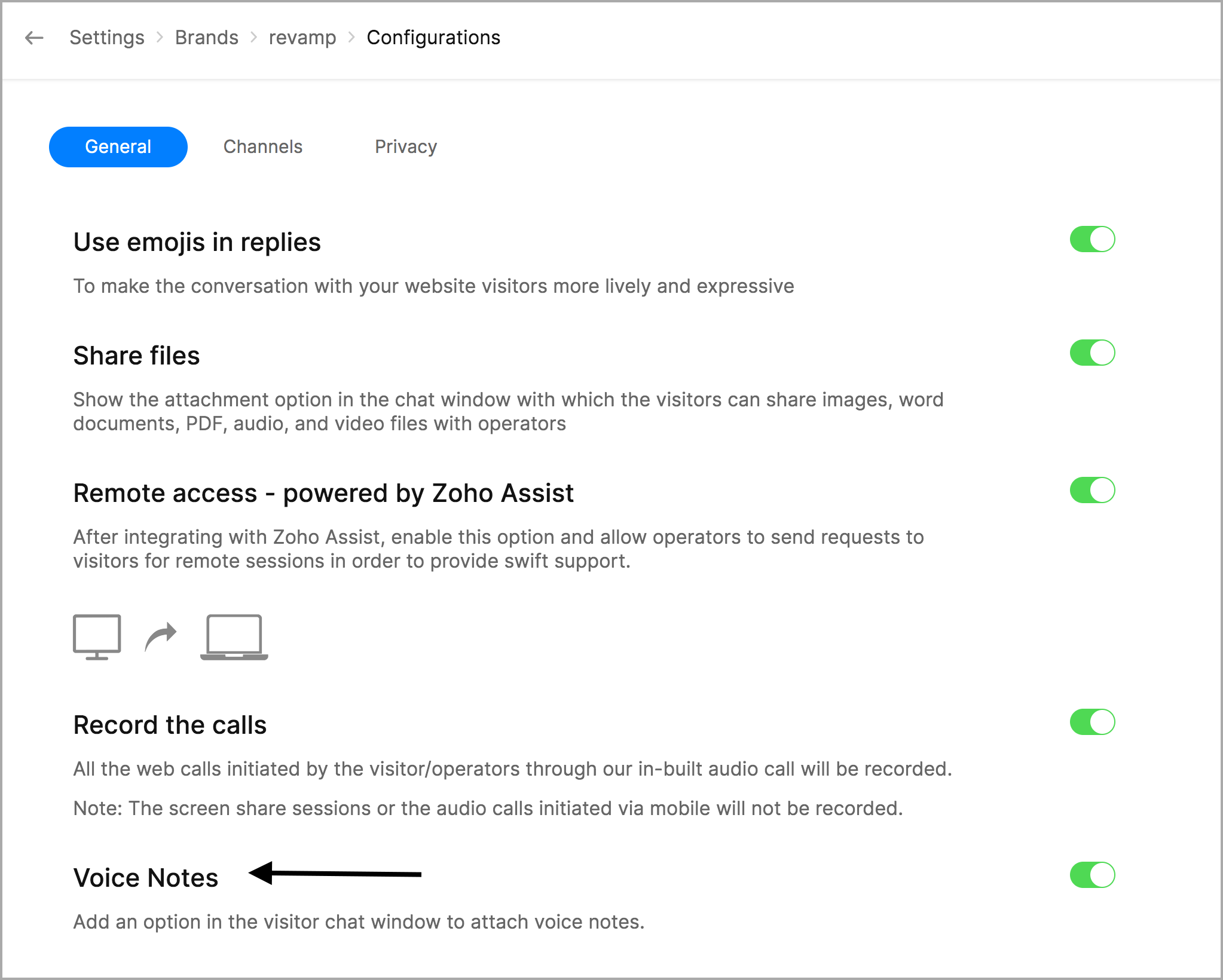 - 在 设置 > 品牌 > 您的品牌 > 配置,向下滚动到语音备注选项。切换开关以启用该选项。