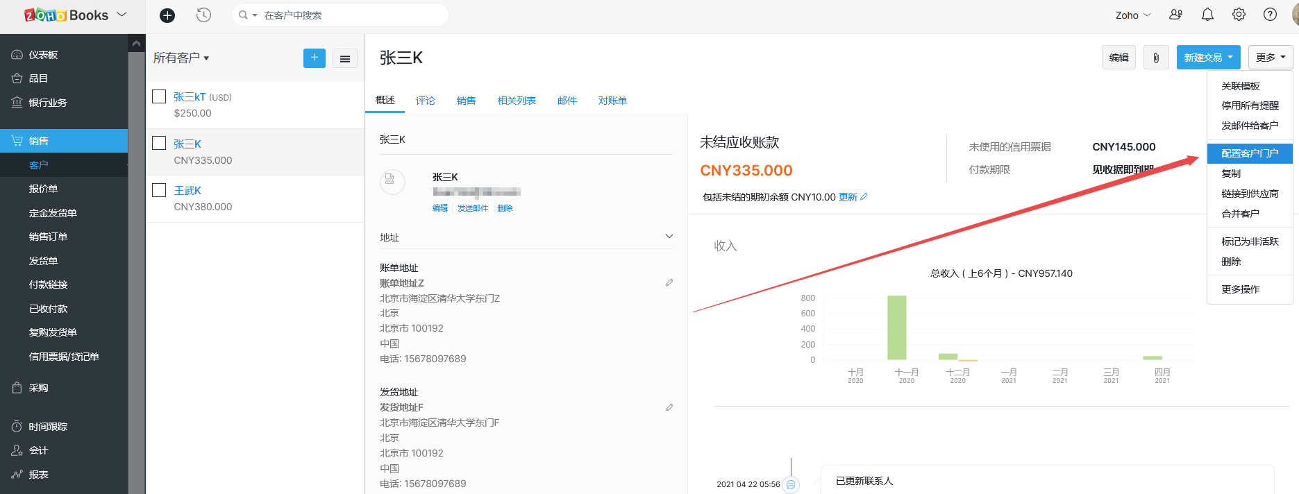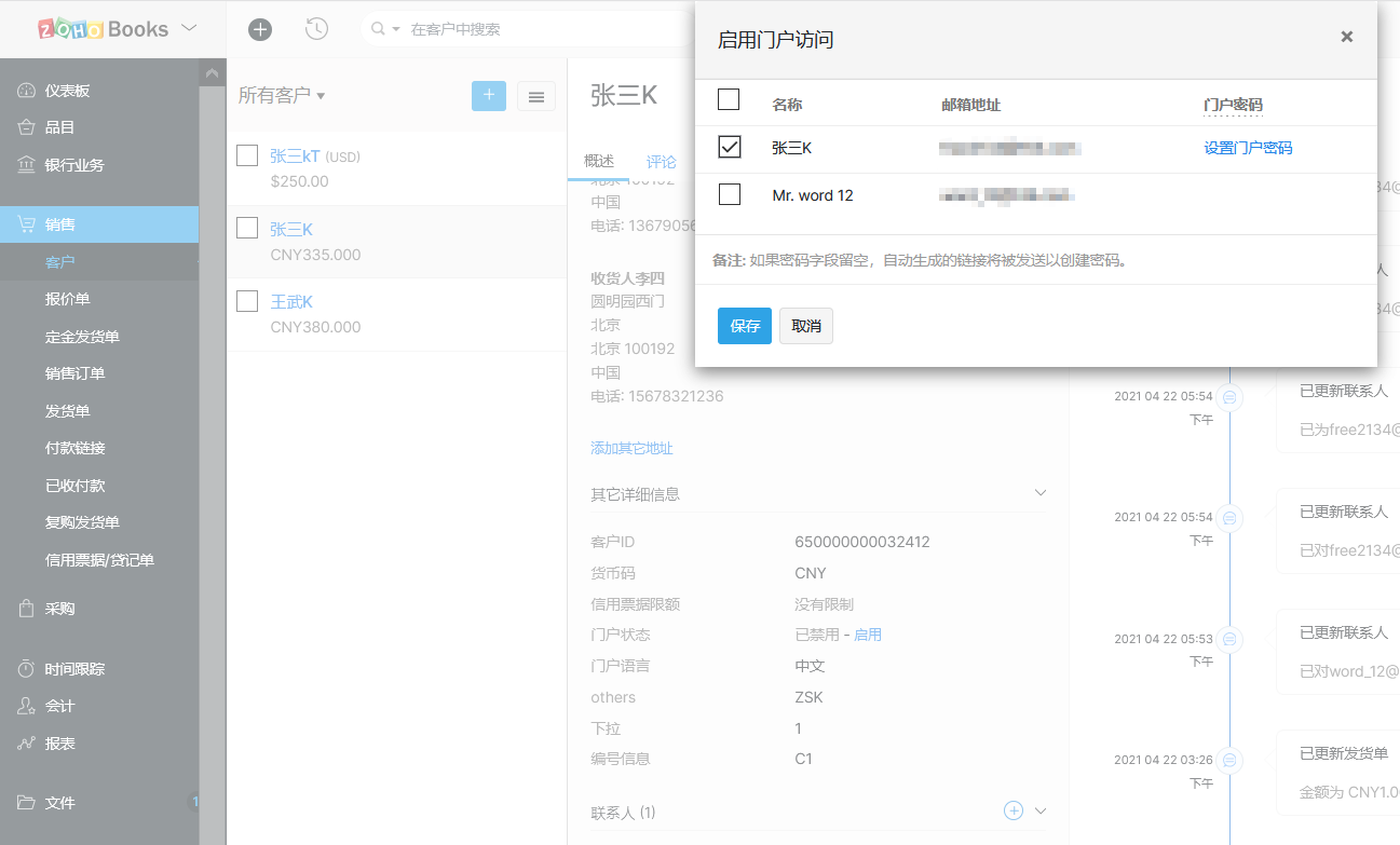 2.选择需要启用客户门户的客户联系人,点击