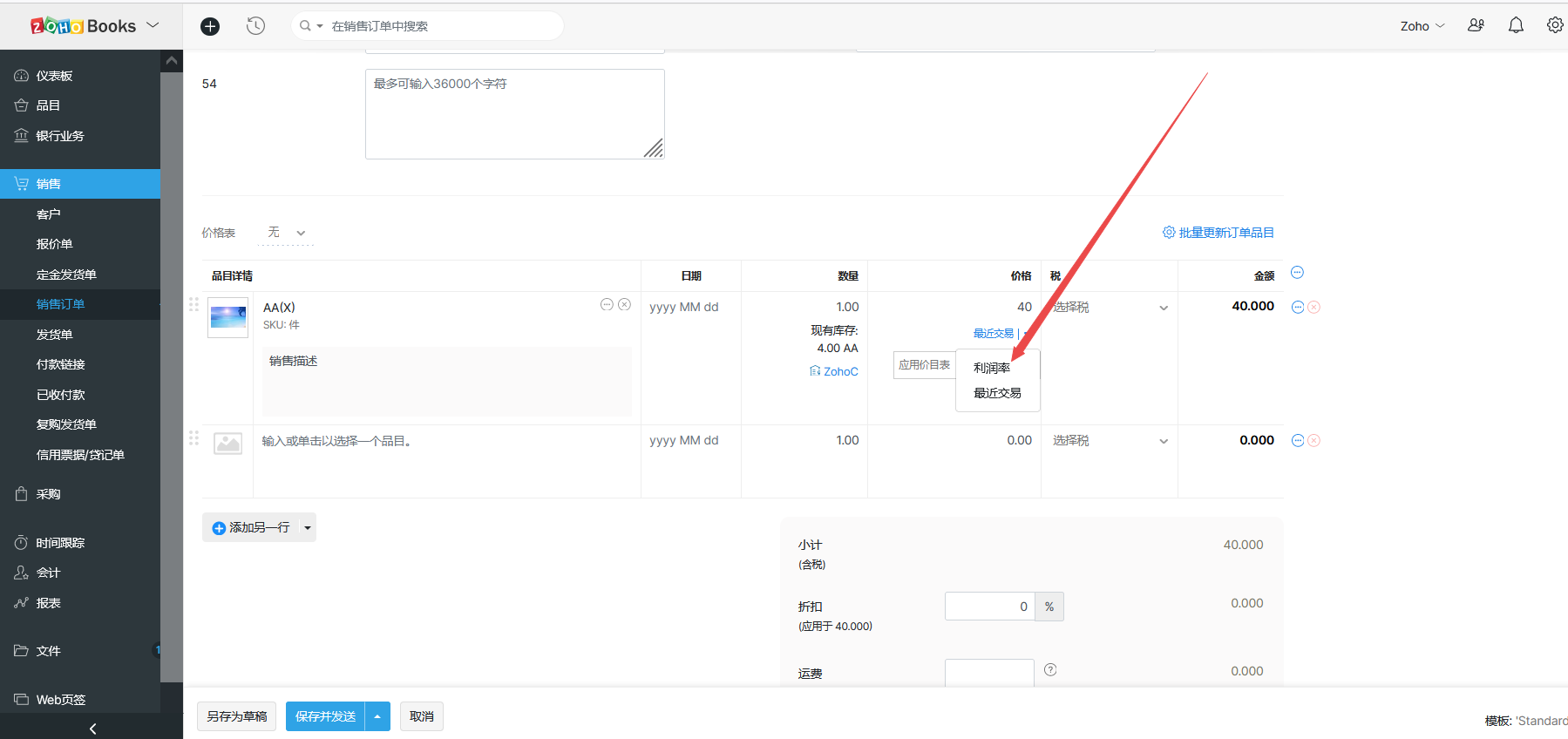 2.选择品目,在价格列的最近交易中,选择利润率。