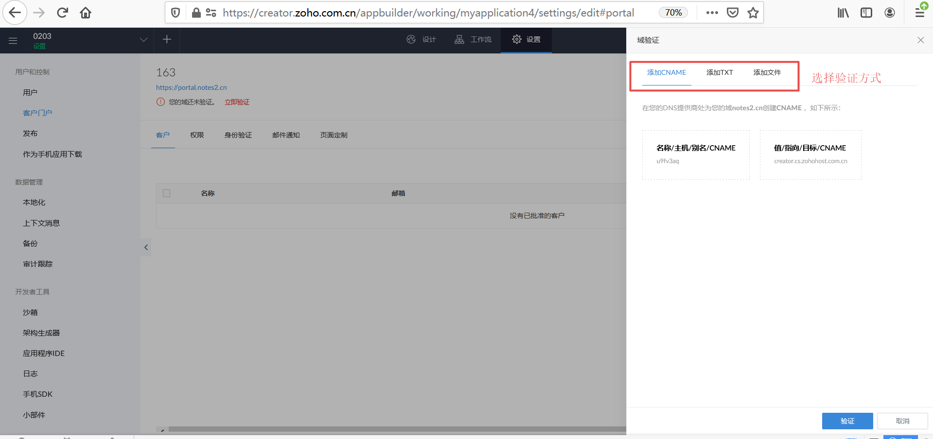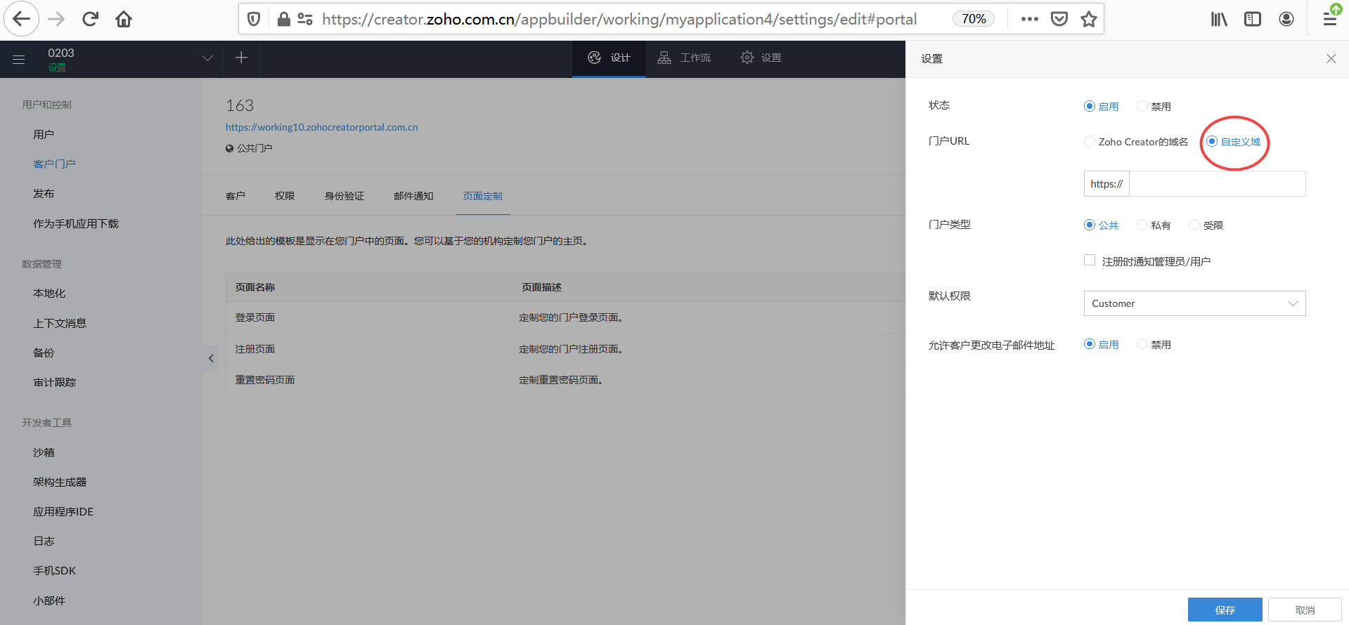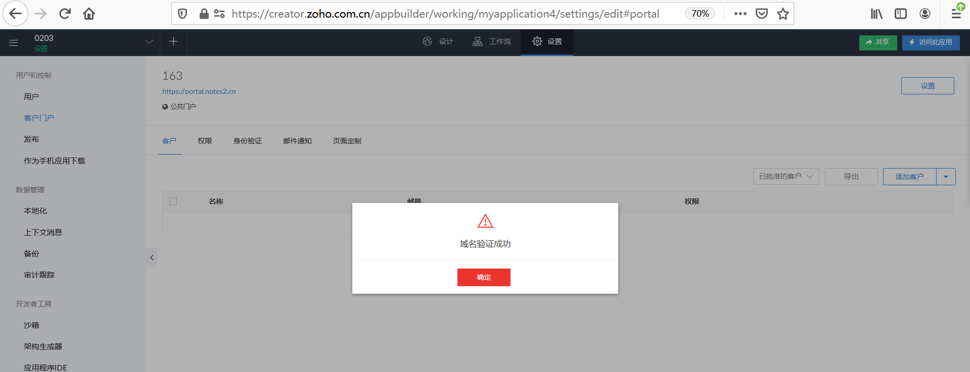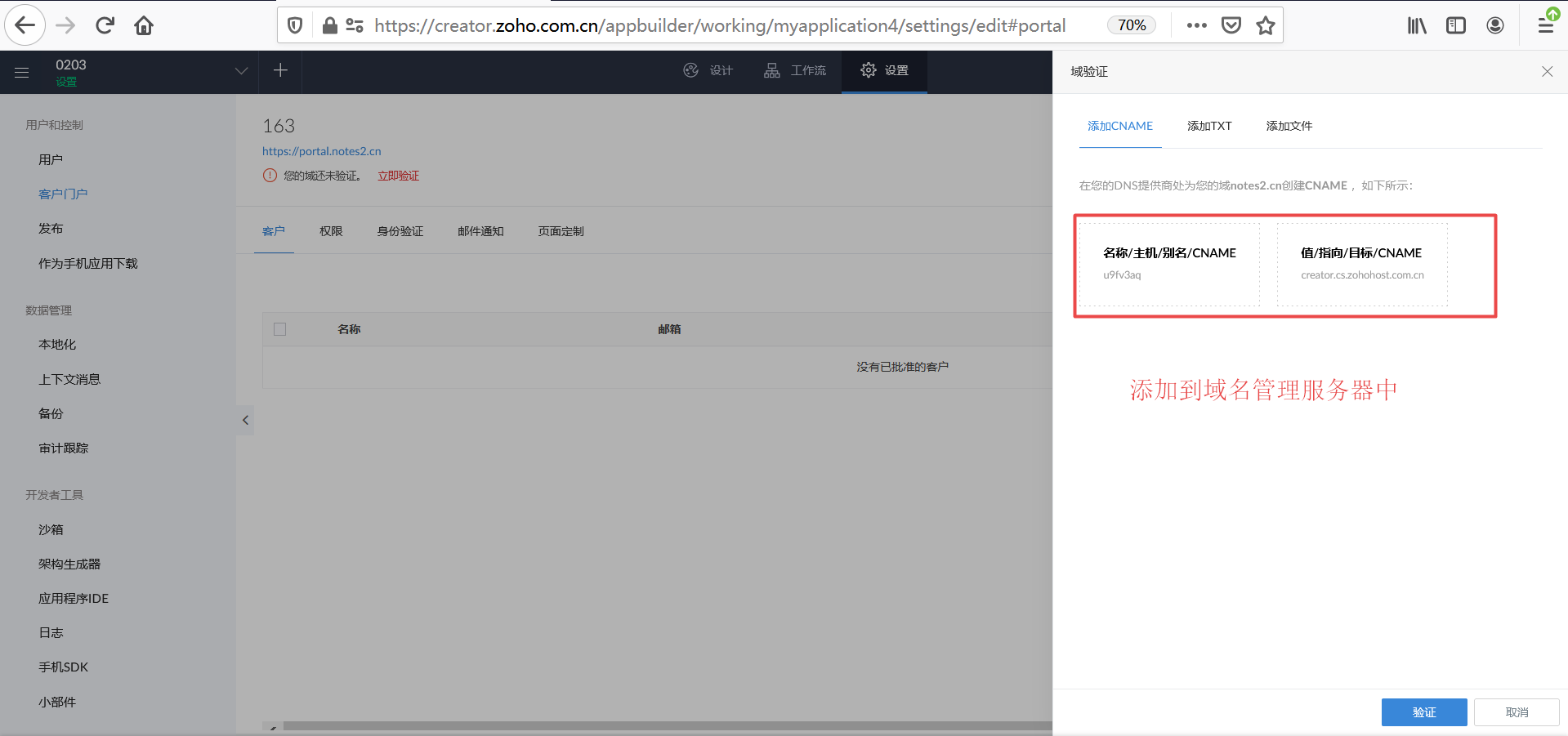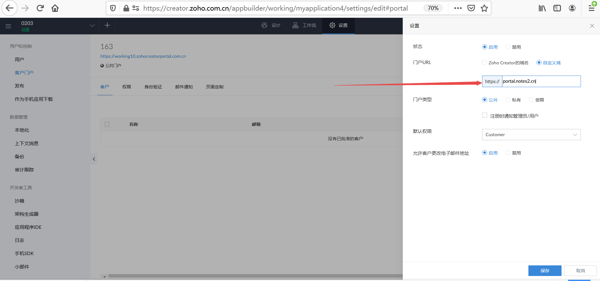 (这里配置的门户url为https://portal.notes2.cn,主机名称为portal,指向creator.cs.zohohost.com.cn)