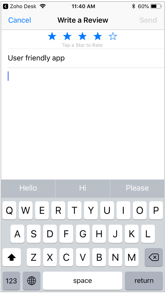 您可以使用Zoho Desk移动应用程序作为反馈来撰写您的体验。如有需要,这将有助于应用开发商和开发人员处理反馈。您还可以发送附件到您的反馈中。