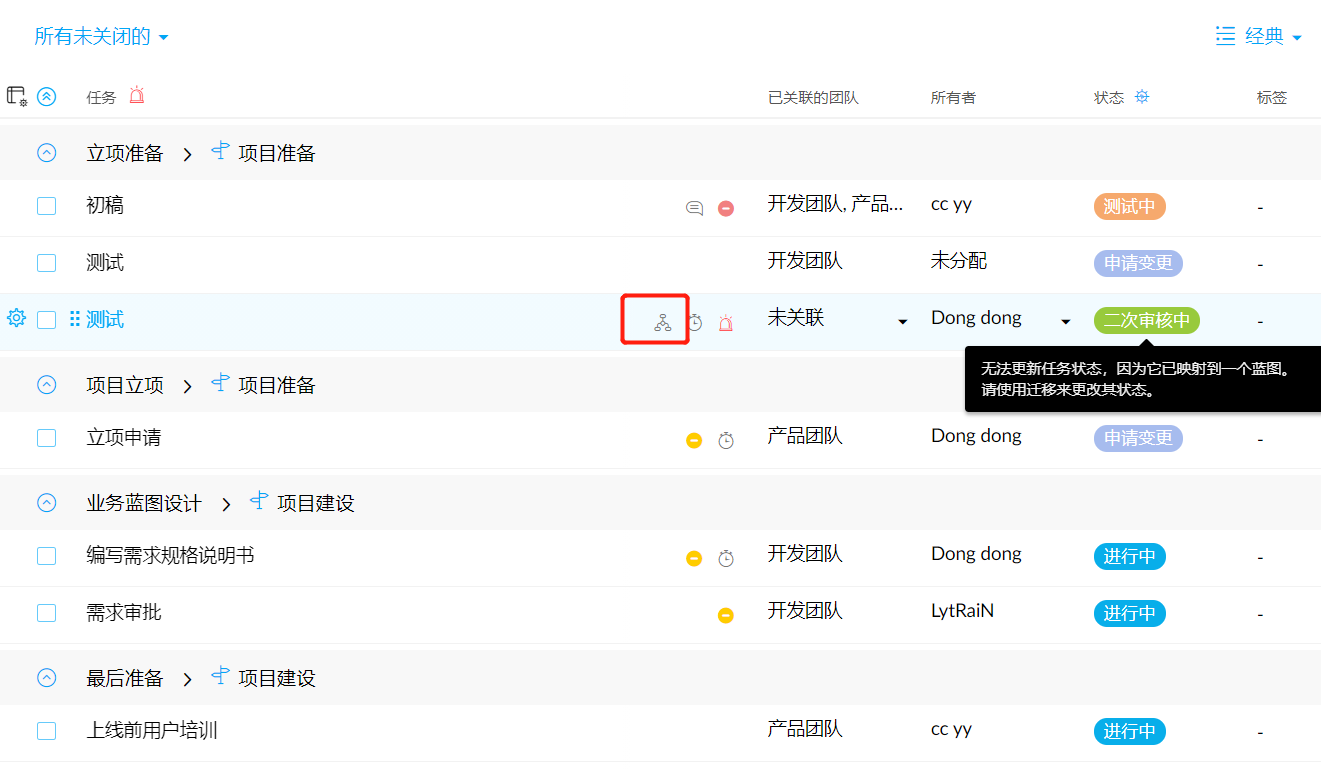 蓝图任务前会有个流程图的标志,点击图标可以看到生效的蓝图流程。普通任务可以随意修改任务的状态,蓝图生效的任务必须要满足条件后才可以进行状态的更新。