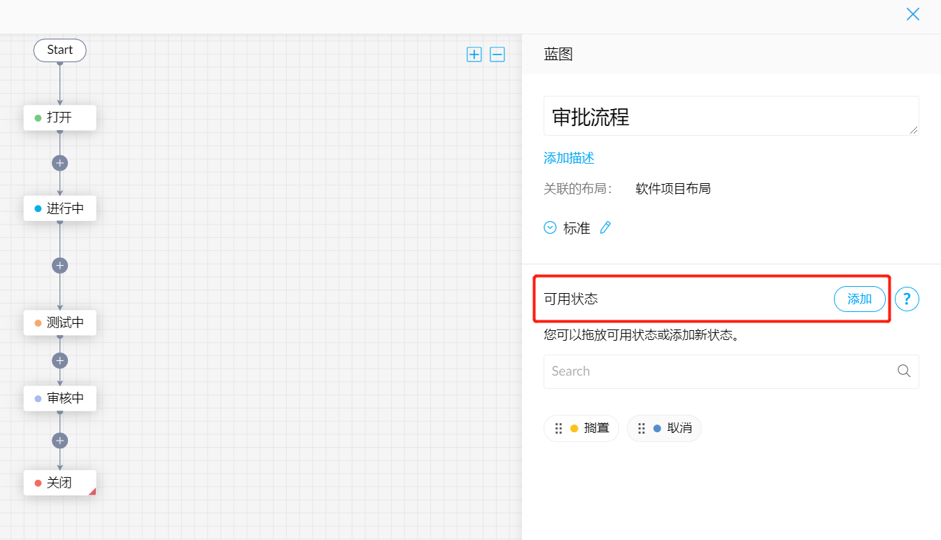 蓝图中的状态和布局与字段中设置的状态是一致的,我们在蓝图中创建的状态会更新到对应的布局中。我们需要先把蓝图中需要的状态拖到左侧的界面,然后进行排序,最后一个状态必须是关闭的状态。