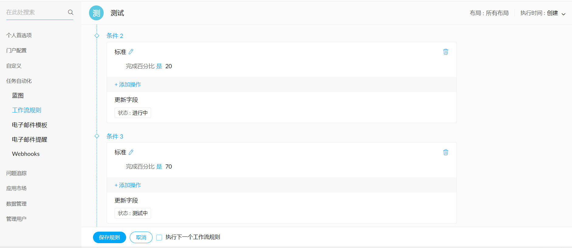 使用工作流规则可以节省我们创建和更新任务的时间,实现状态和任务百分比的自动联动。