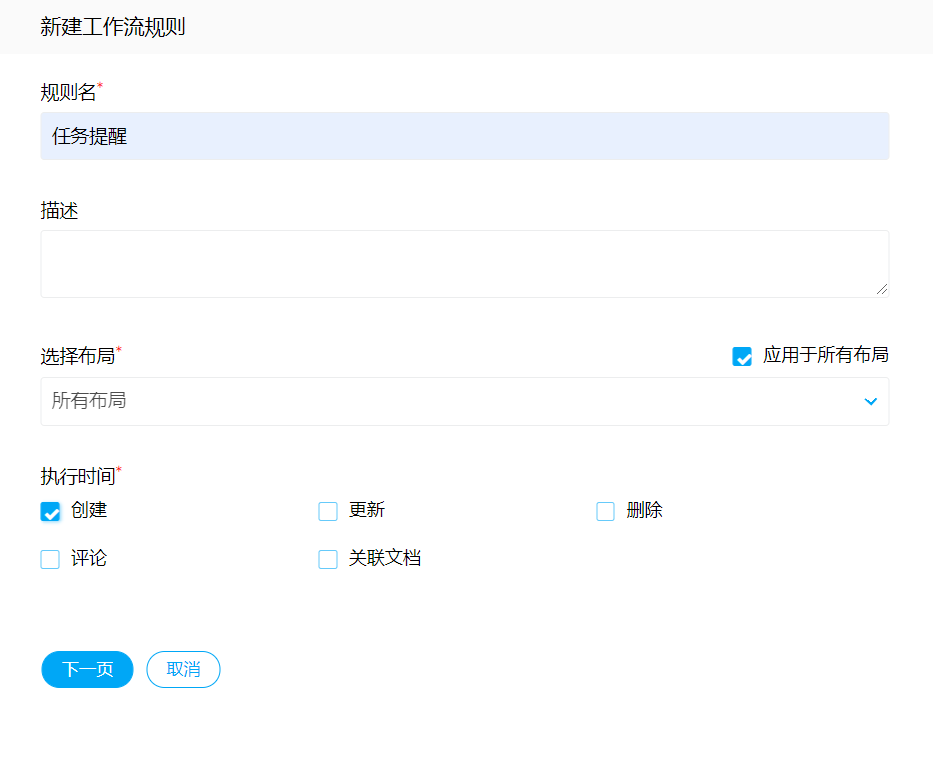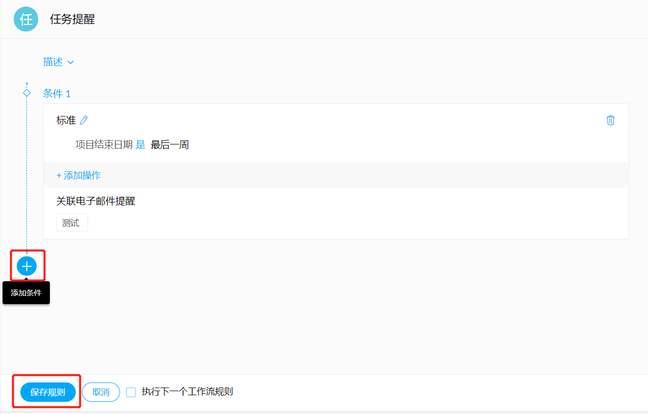 点击新建工作流规则,输入规则名,执行时间选择“创建”时,则在任务创建时就会触发这条工作流。进入下一页,设置条件和触发操作。