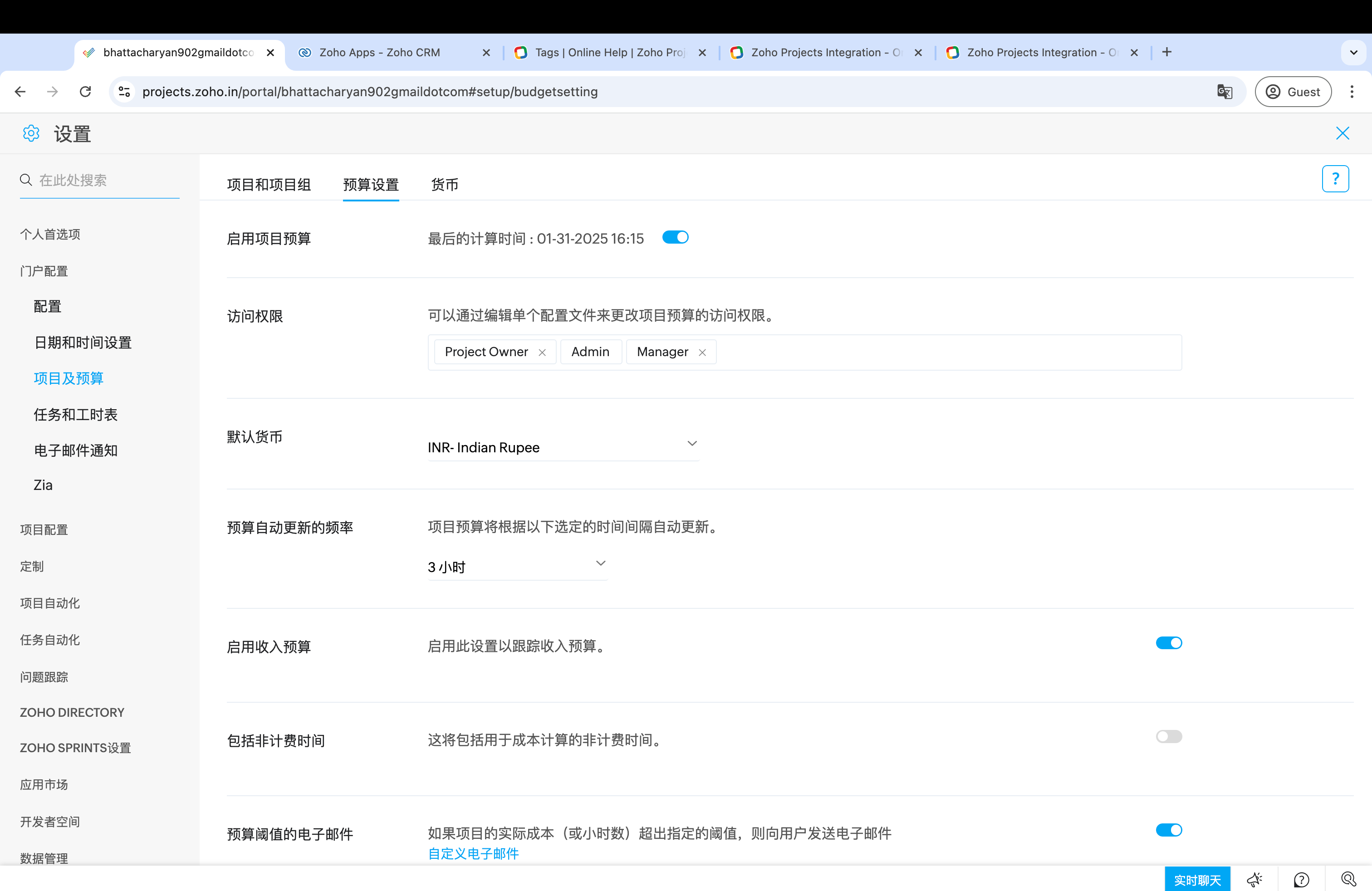 在 Zoho Projects 中查看预算的位置