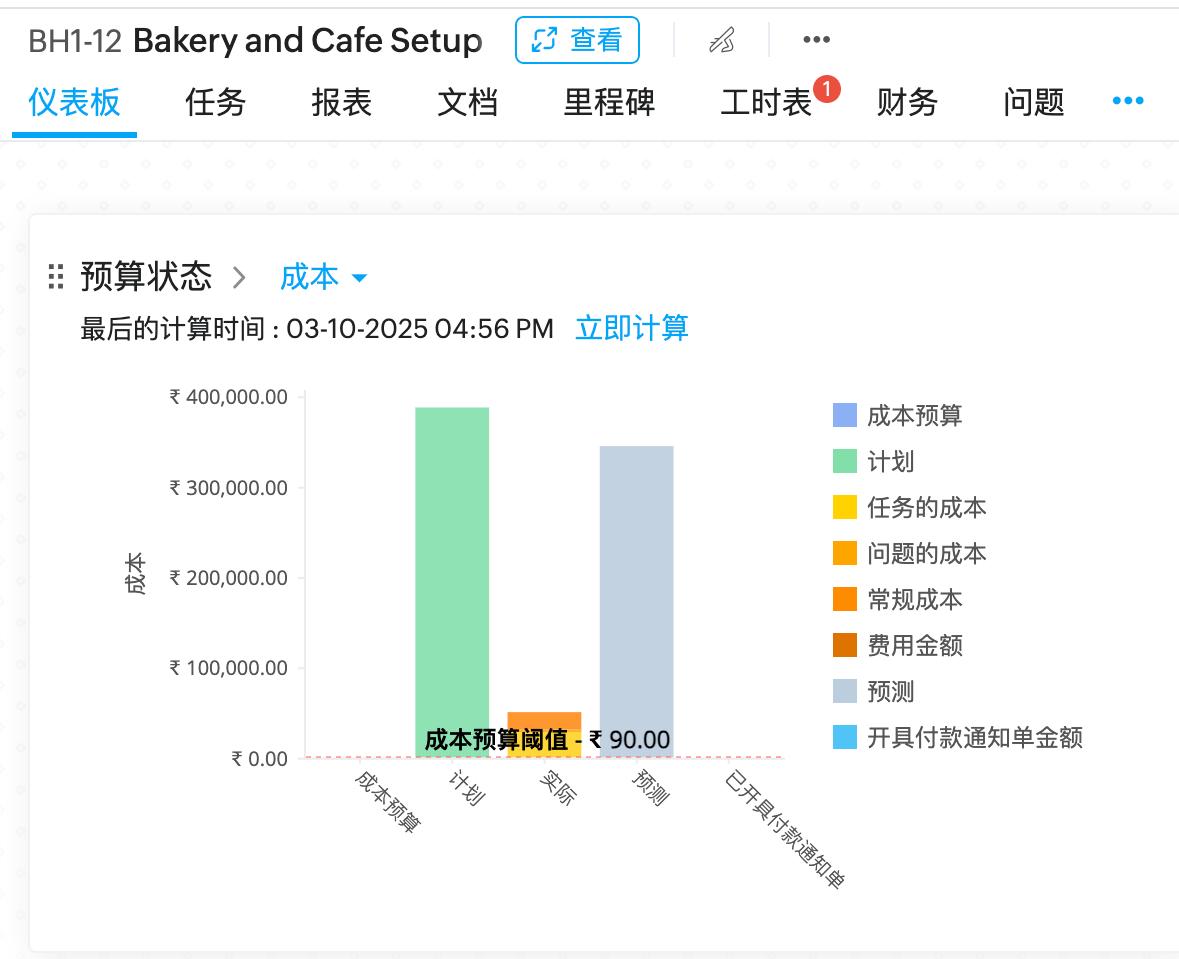 项目预算图表显示在仪表板上。如果您无法查看预算详细信息,请单击并启用预算状态。图表详细显示了任务的计划成本和实际成本。成本差异是计划成本和实际成本之间的差额。当计划成本高于实际成本时,预算盈余,否则预算超支。