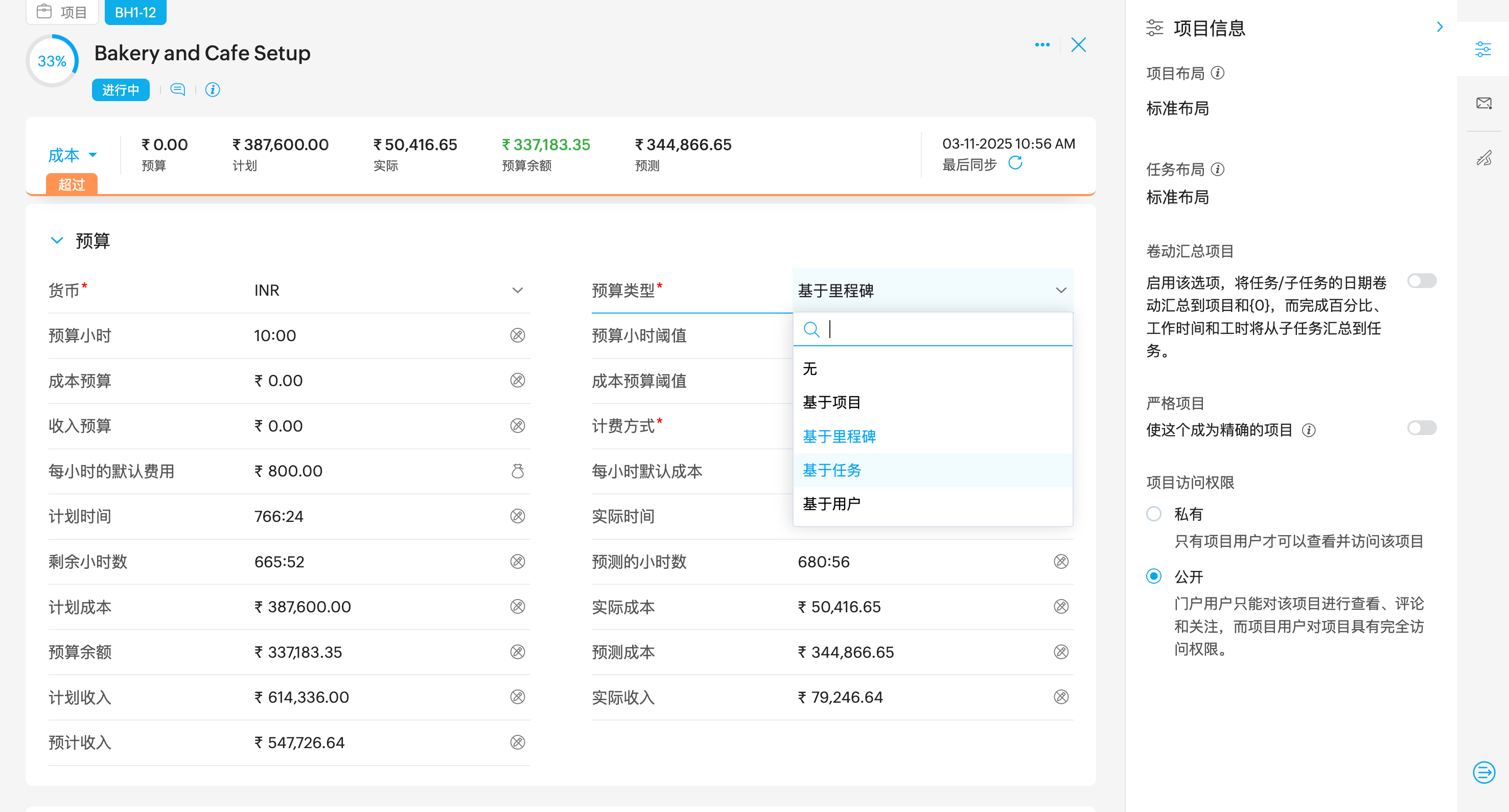 导航到任务模块,单击并从“预算健康状况”字段中选择“超支”。如果向客户收取费用,则可以将记录小时数标记为可计费,或标记为不可计费以表明不收取小时数。当团队成员记录任务时间时,它将自动计算已批准的可计费小时数的实际成本。这会实时更新预算。