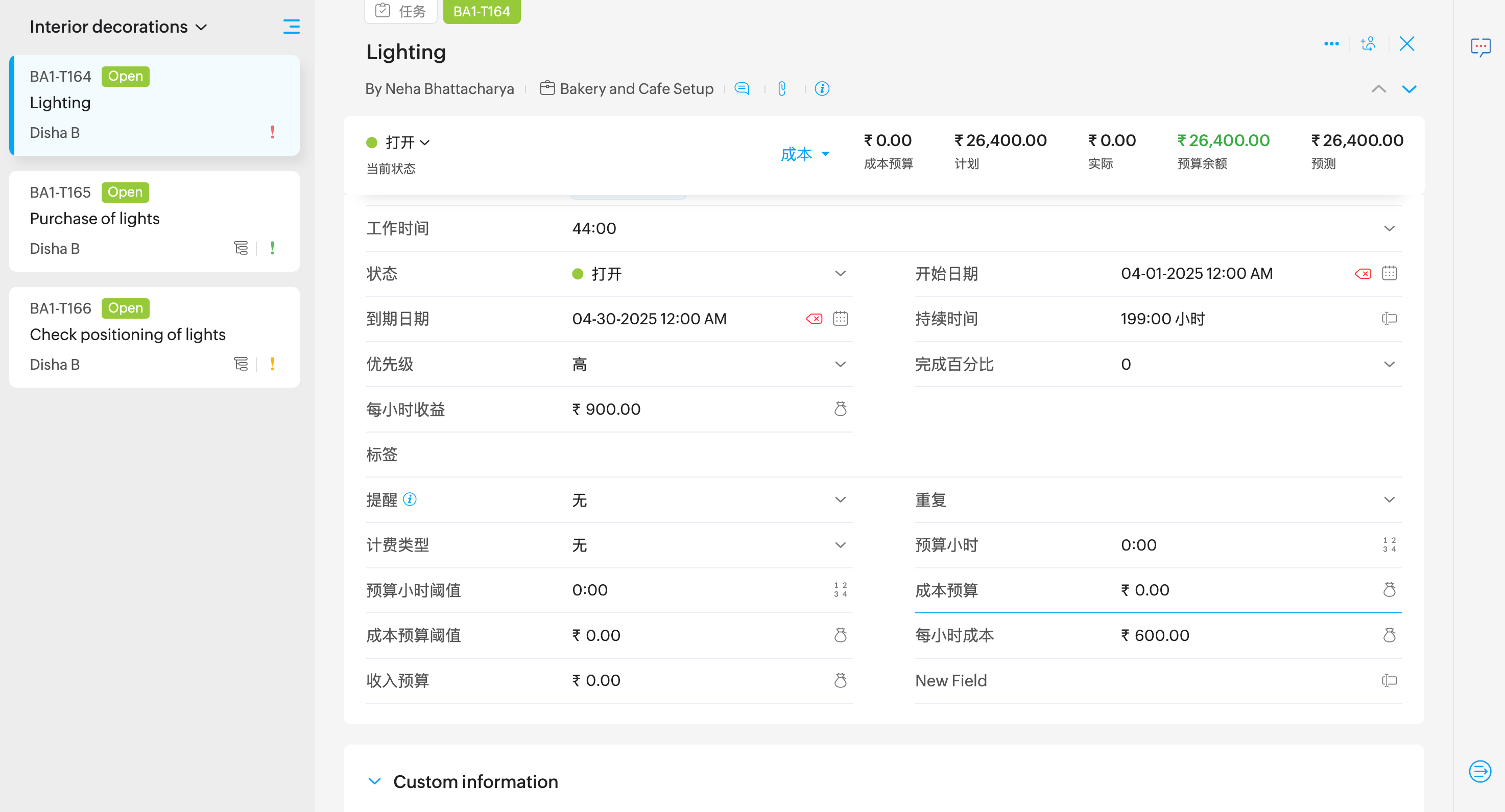 在任务列表和详细视图中查看计划成本与实际成本以及成本差异详细信息。只有在设置页面中启用预算后,此功能才可用。启用任务预算后,您可以查看差异列,其中将显示计划小时数和实际小时数之间的差异。预算余额列将突出显示计划成本和实际成本之间的差异。