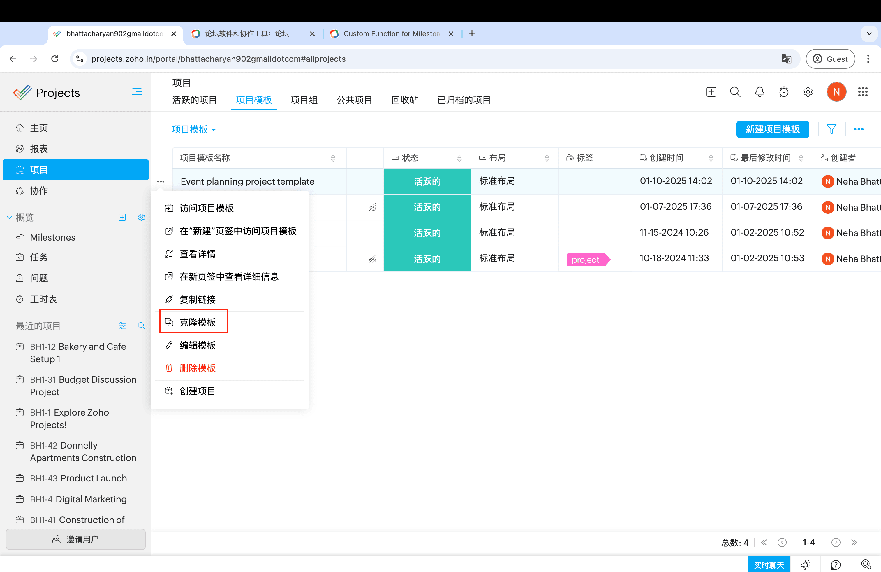 4. 单击 或右键单击并选择“克隆模板”以克隆项目模板。