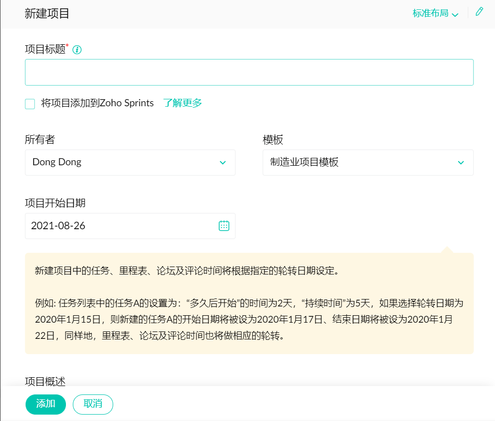 6.如果要,选择一个模版和一个所有者,输入开始和结束日期并创建项目概览。