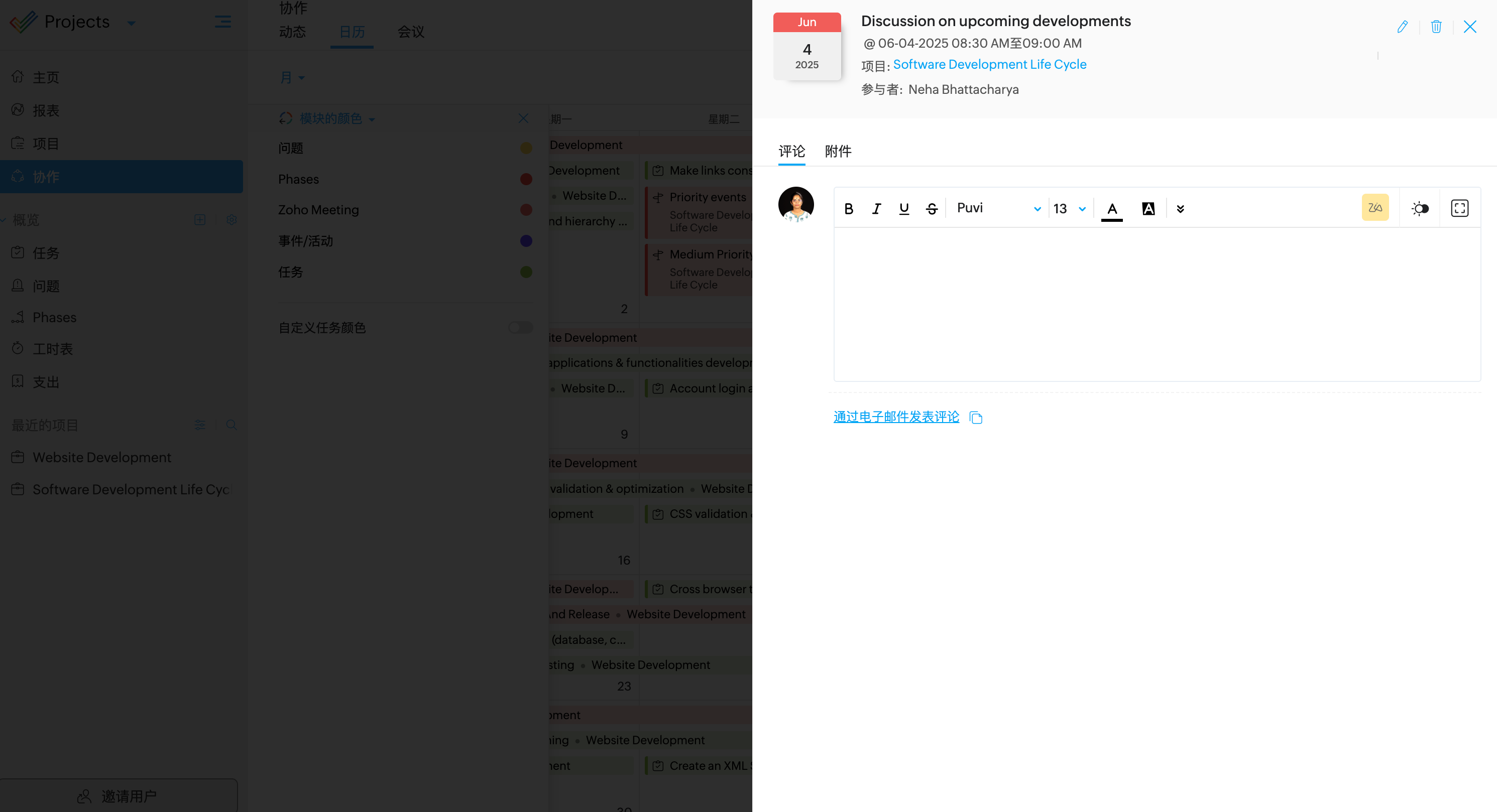 这个选项“与团队计划活动“,可以帮助您跟踪工作状态。例如,如果您即将完成一个里程碑,并且想要了解该里程碑的状态,例如已完成的任务数量、逾期的任务数量等等,那么您需要与团队会面以了解进度。如果您在日历视图中灵活工作,那么可以直接在日历中计划活动。