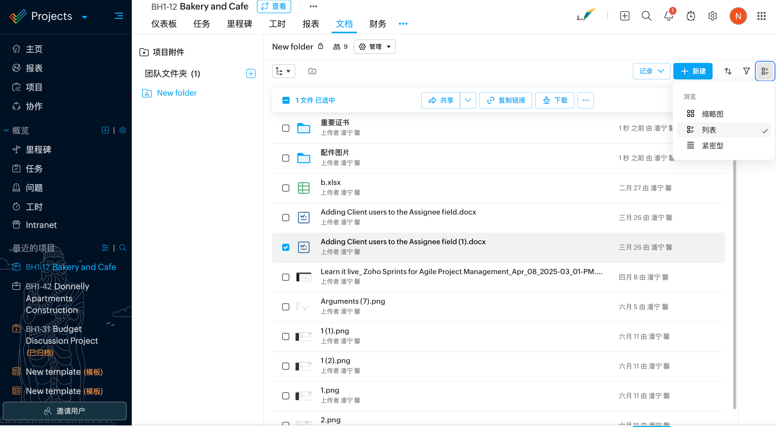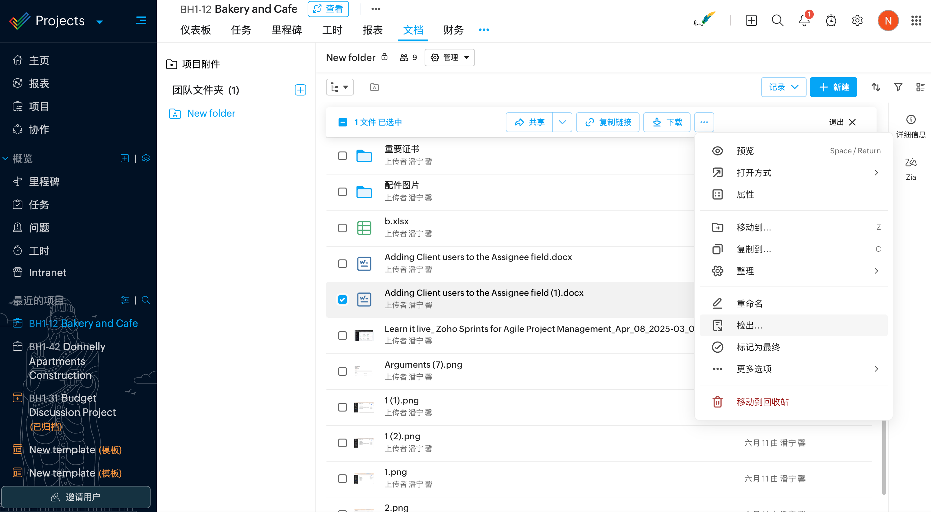 Zoho Projects 支持对您的文件进行多项操作。右键单击文件,然后点击: