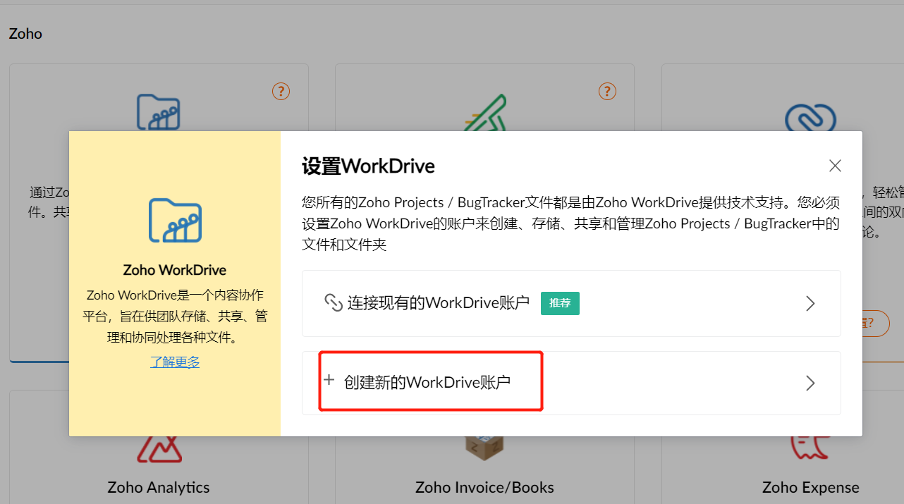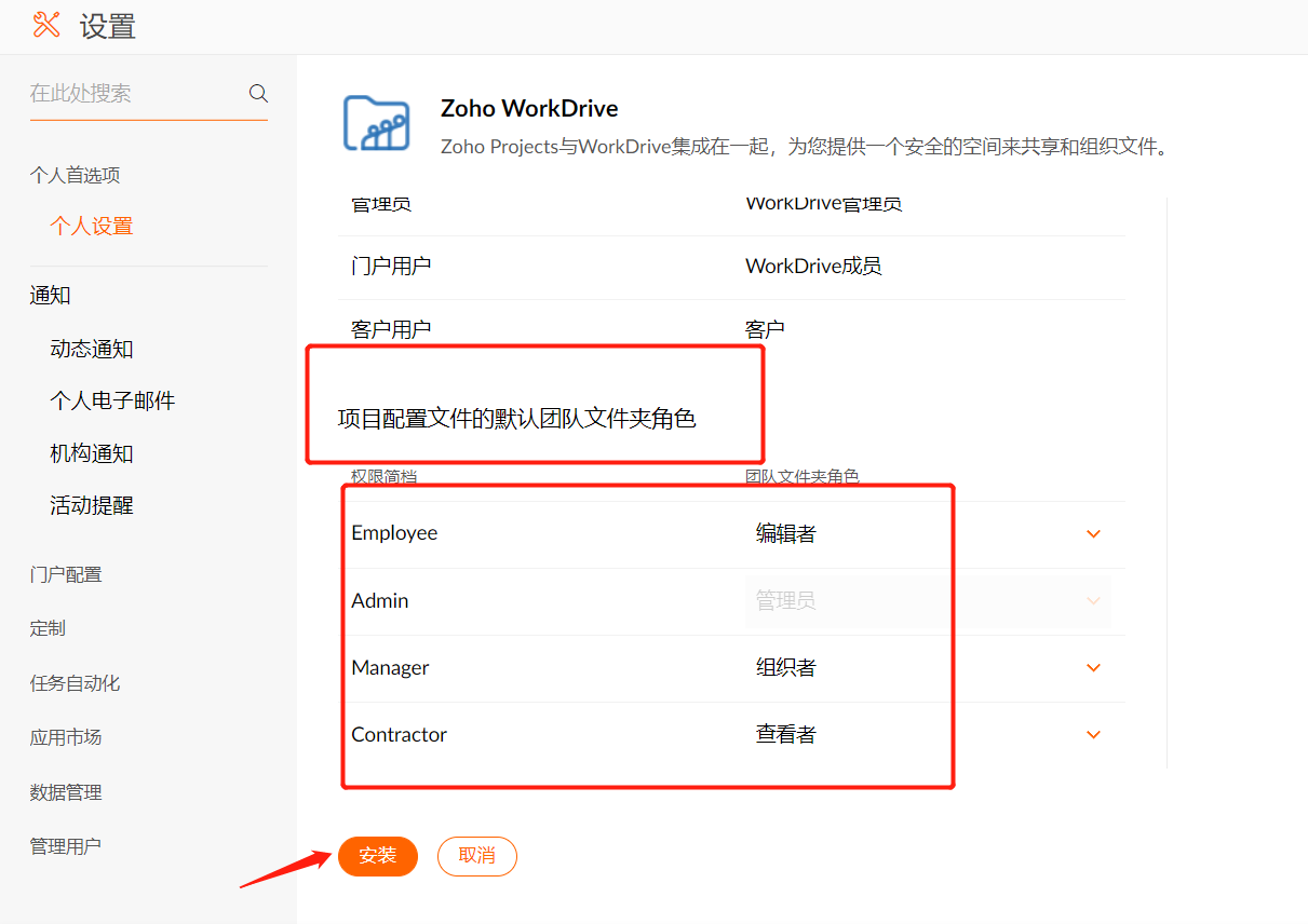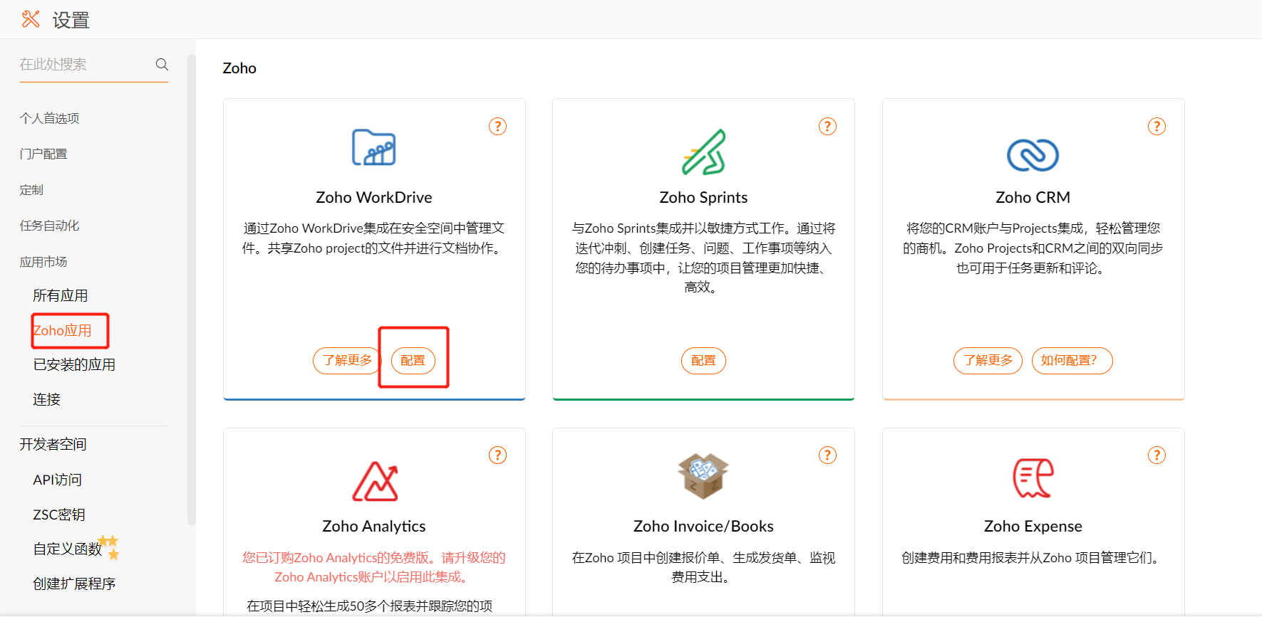 在设置界面—应用市场中找到Zoho WorkDrive,点击配置,进入配置界面