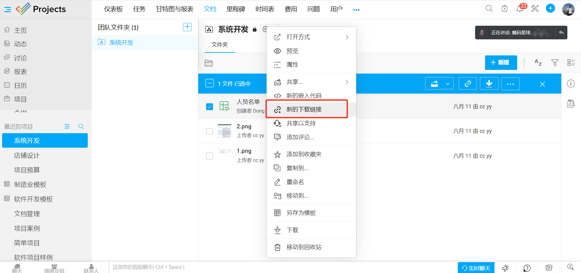 点击新的下载可以将文件推送给项目之外的成员进行下载查看。