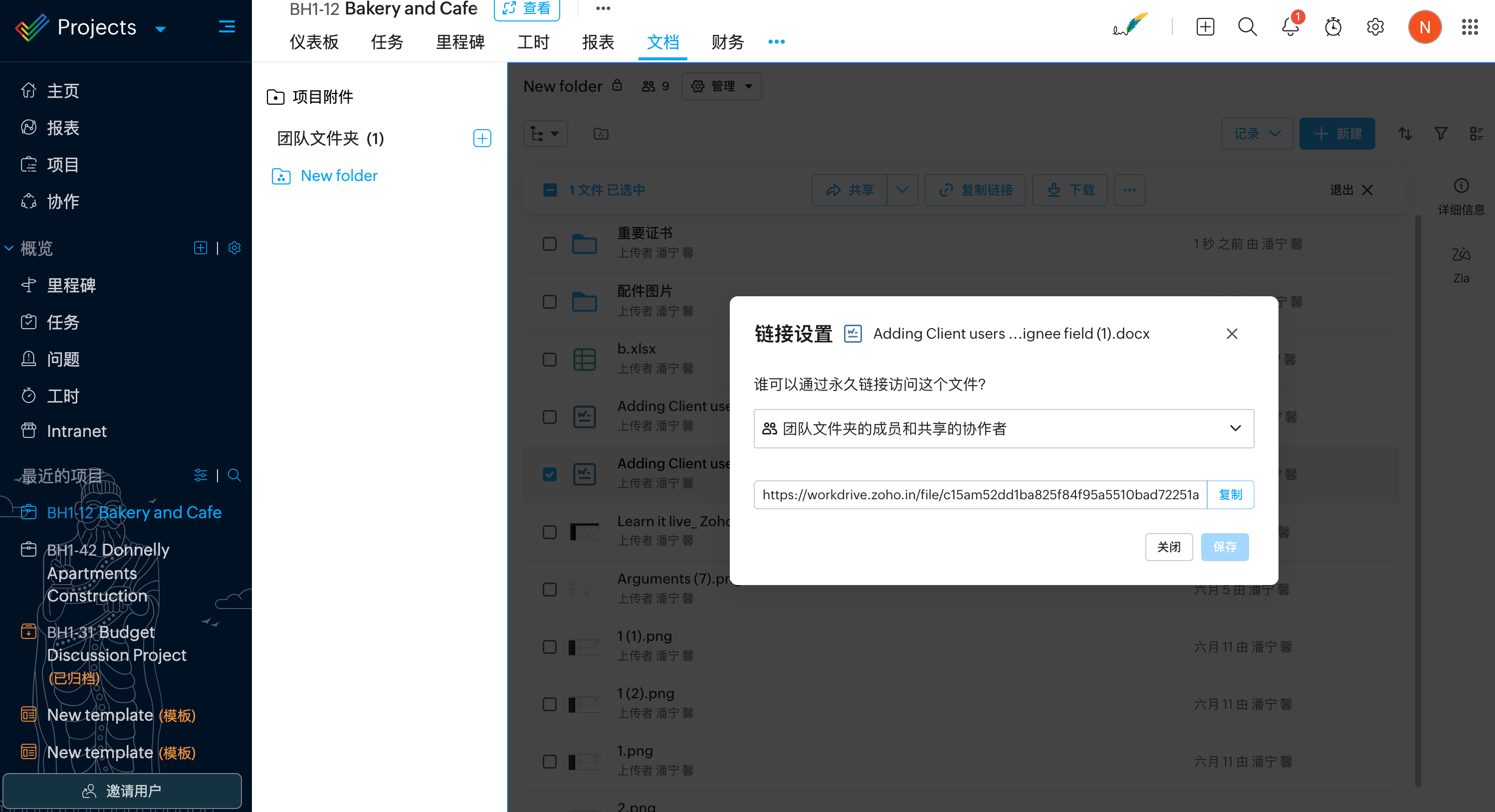Zoho WorkDrive 允许您通过以下方式在内部共享“我的文件夹”中的文件和文件夹: 与团队成员单独共享文件或文件夹 与整个团队共享文件或文件夹 与团队成员单独共享文件或文件夹 1. 在左窗格中选择我的文件夹。 2. 选择一个文件或文件夹,然后单击顶部操作栏中的共享图标。此时将出现一个“共享”对话框。 或者,您也可以右键单击文件或文件夹,然后选择共享。 3. 输入团队成员的电子邮件地址,然后为其分配一个访问权限级别。 文件的权限包括: 共享 - 协作者可以共享、编辑文件和为文件添加评论 ...