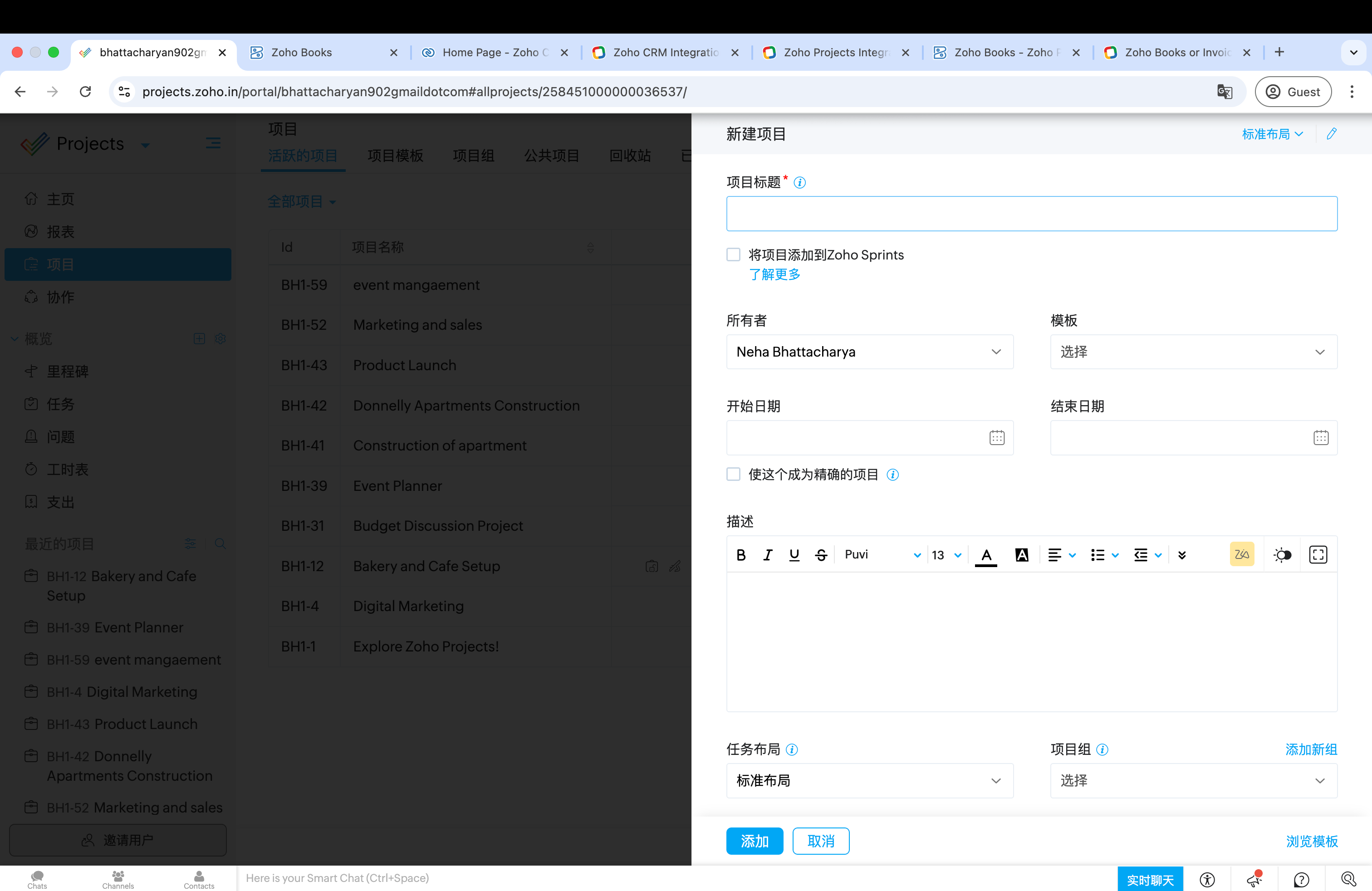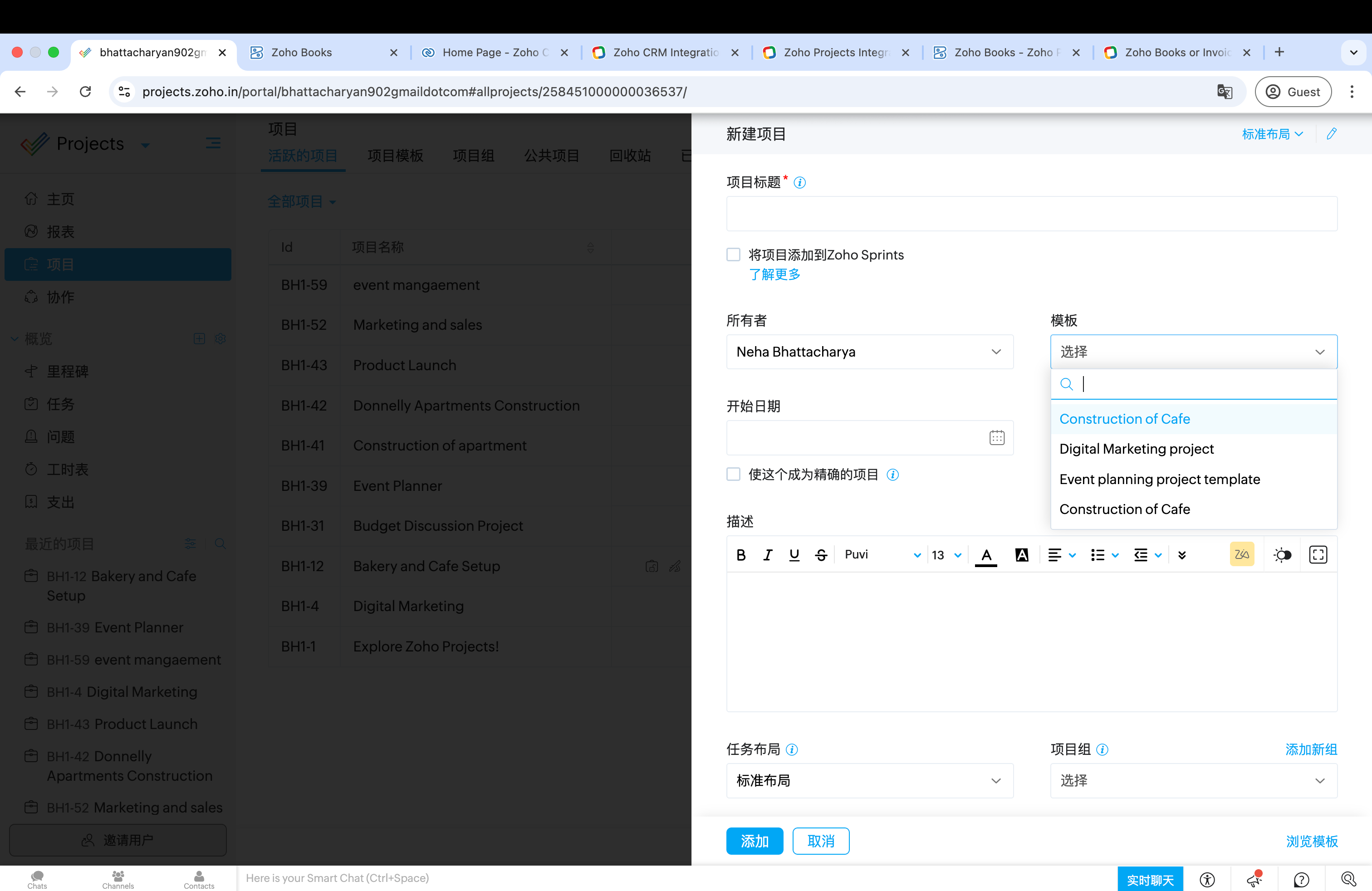 建筑:一家建筑公司接到一份建造别墅的合同。但是,他们已经在 Zoho Projects 中为同一别墅类型的建筑创建了一个项目。为同一项目类型从头开始创建项目非常耗时。您可以使用此选项从现有的别墅类型项目创建新项目。