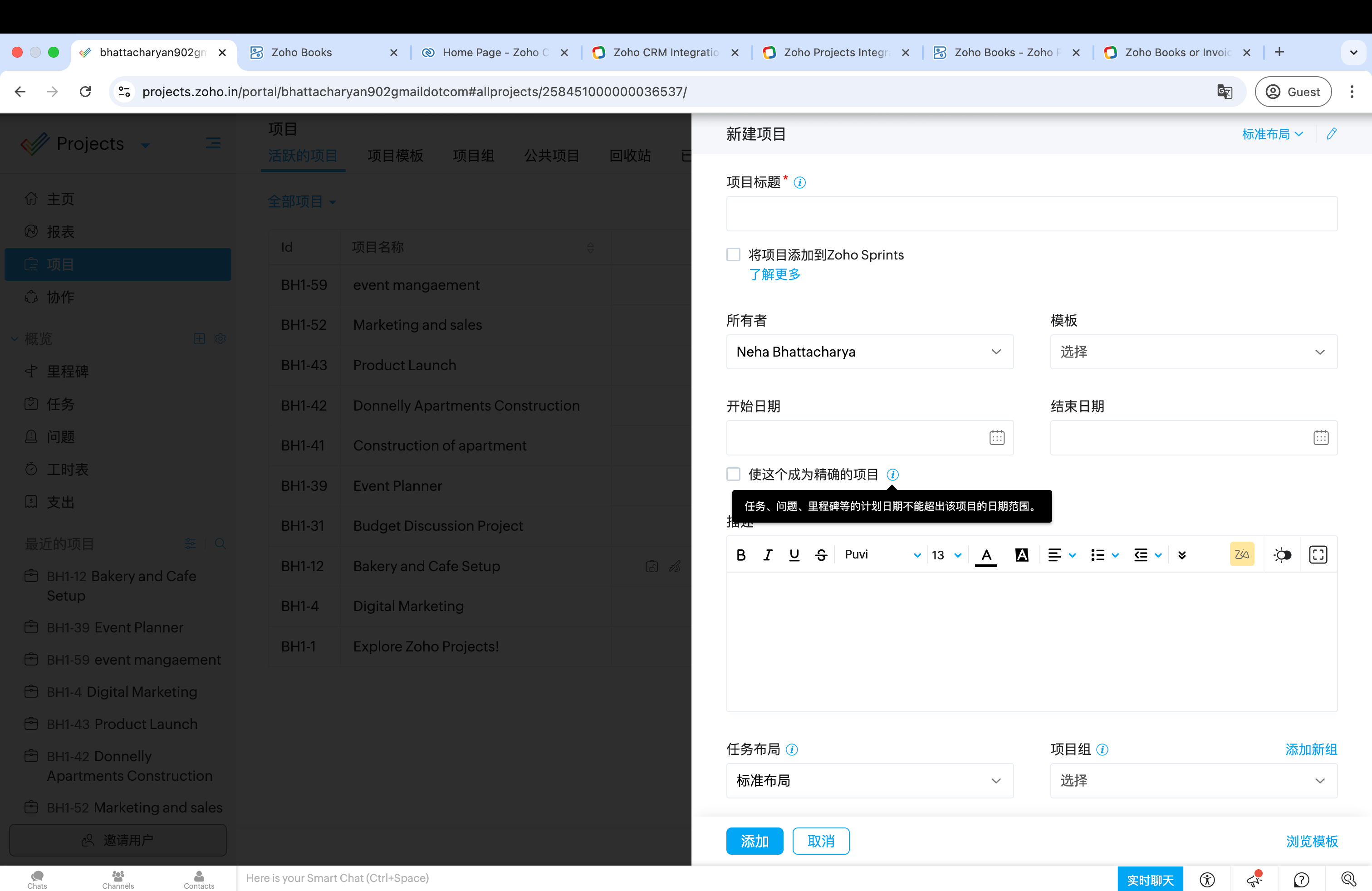 如果您将其设为精确项目,则项目模块(如阶段、任务等)的开始和结束日期必须在预定的项目开始日期和结束日期之内。