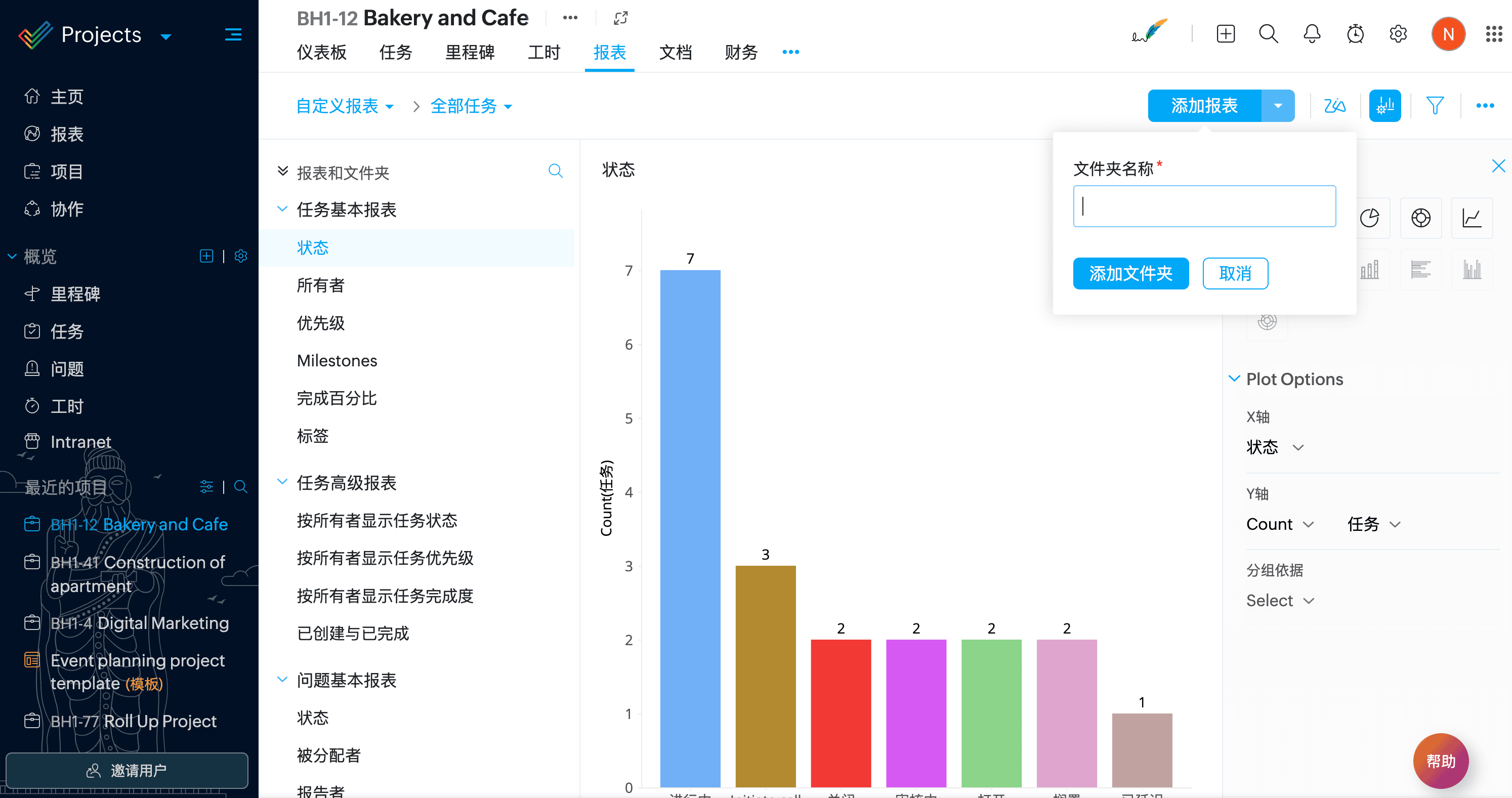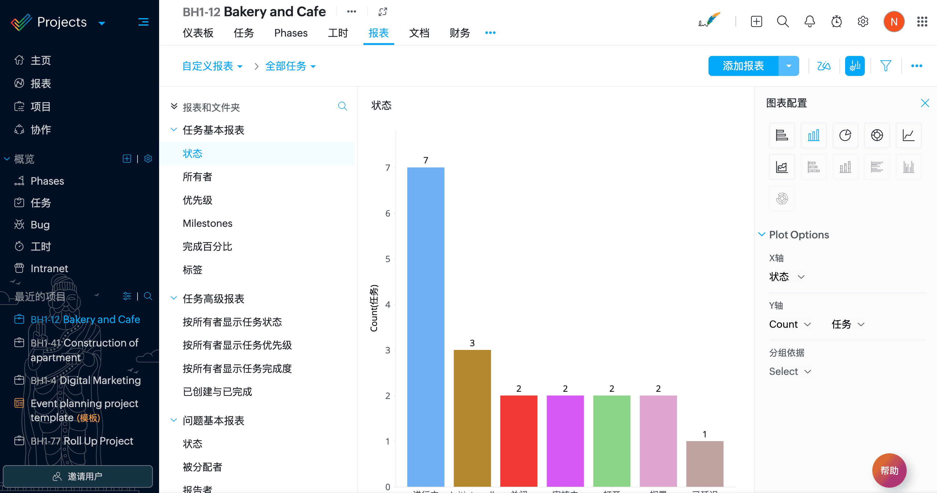 基础报表提供按五个不同标准统计的任务数量:状态、里程碑、优先级、标签、负责人或完成百分比。