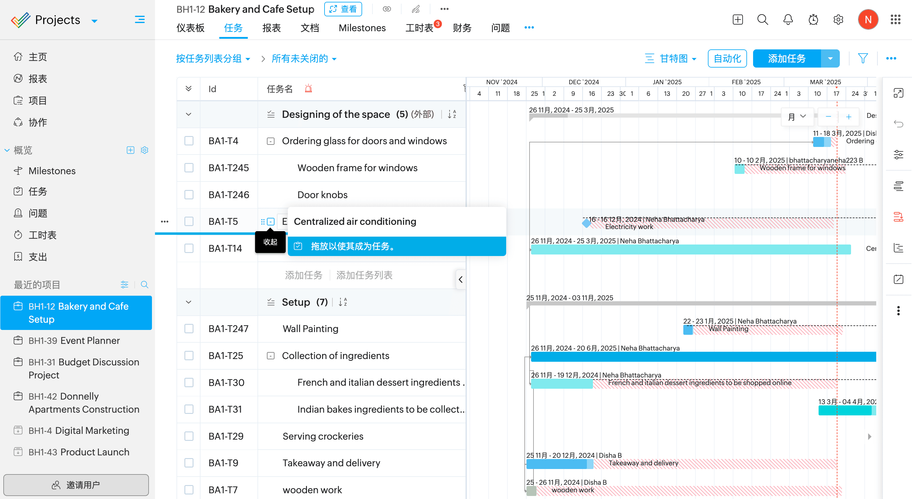 例如,作为监督 Web 开发项目的项目经理,您可以有效地利用子任务功能来简化项目。重新设计零售商的电子商务网站的任务,您可以将主要任务分解为特定的子任务:用户界面大修、支付网关集成、移动优化和安全增强。您可以为每个子任务设置优先级、持续时间、完成百分比、受让人、开始日期和结束日期以跟踪进度。您可以快速重新排序子任务,也可以在父任务和子任务之间进行转换。汇总功能提供了时间表和工作时间的综合视图,有助于高效的项目管理。