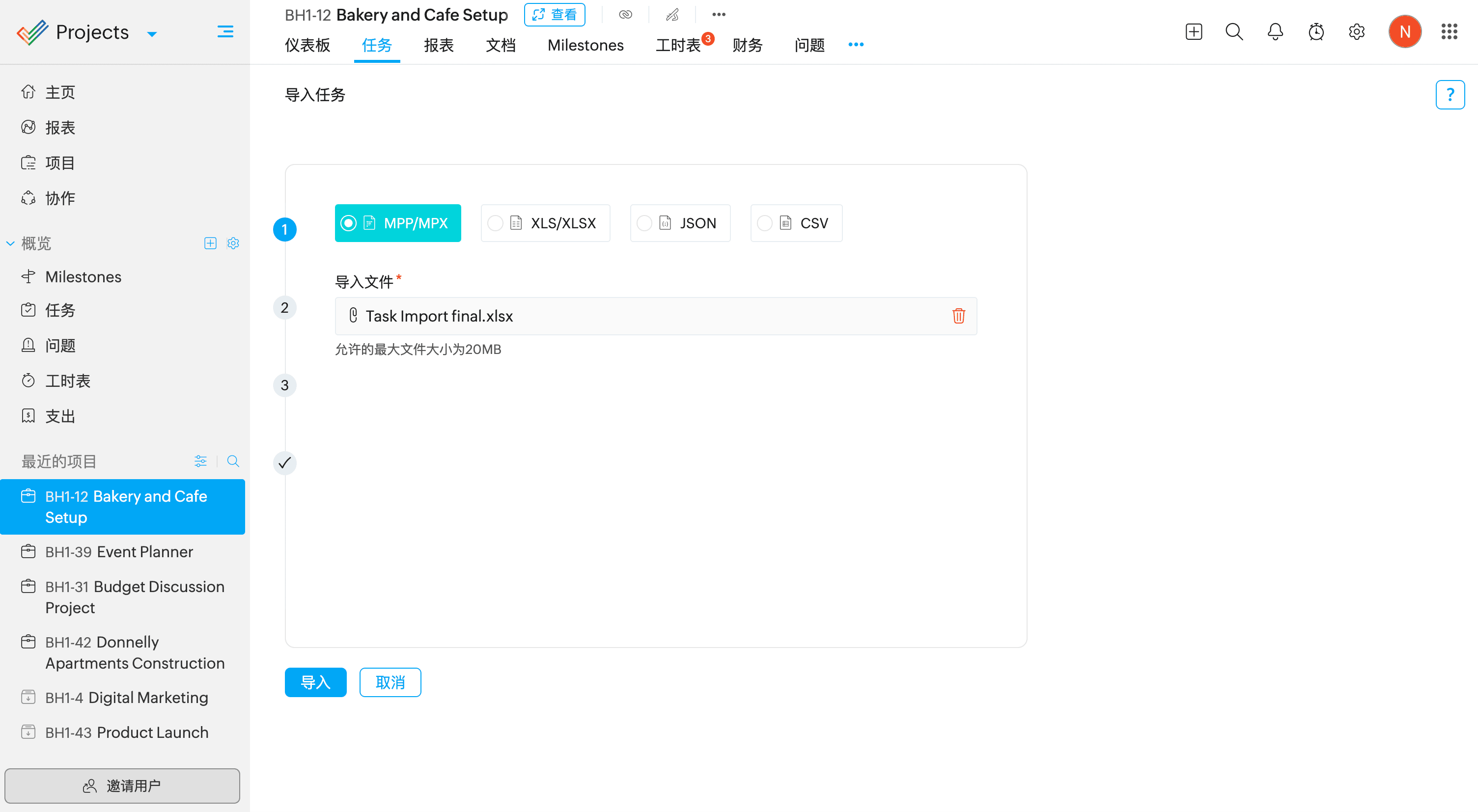 将 MS 项目文件导入 Zoho Projects 时,将子任务与现有任务一起导入。