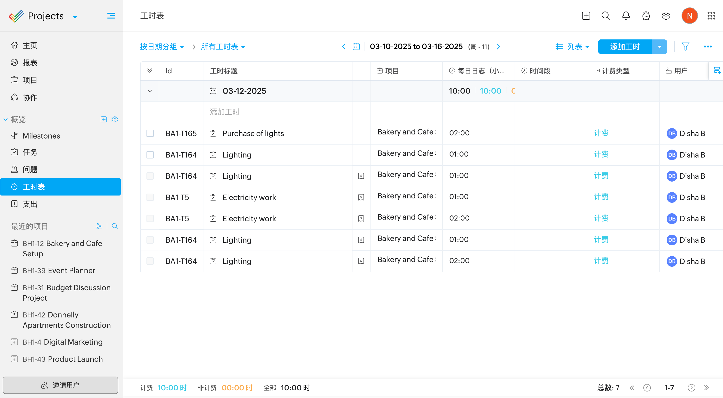 时间表以易于理解的表格显示用户记录的小时数。时间表可以按日期或用户分组。时间表组可以从概览部分查看,也可以从项目内的时间表模块查看。