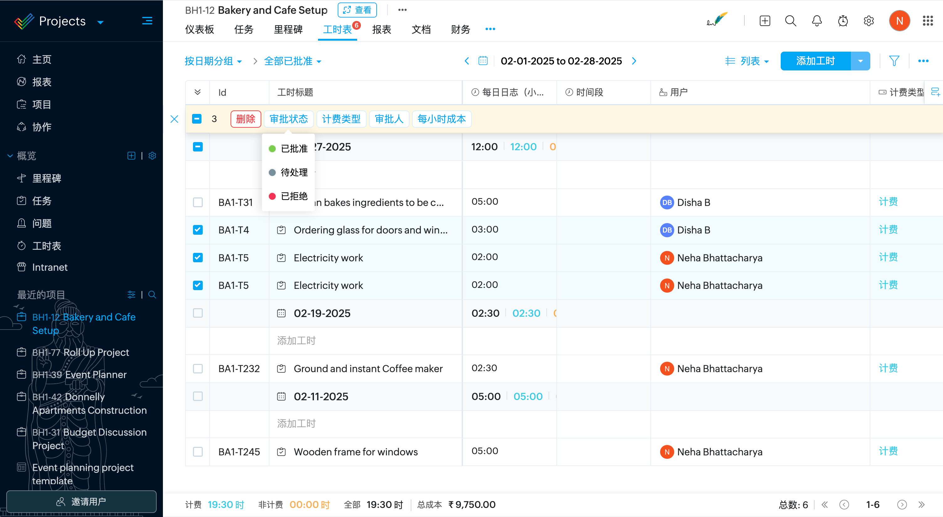 时间表也可以批量批准。选择一个或多个记录,然后单击批量更新选项中的批准状态。选择所需的状态。