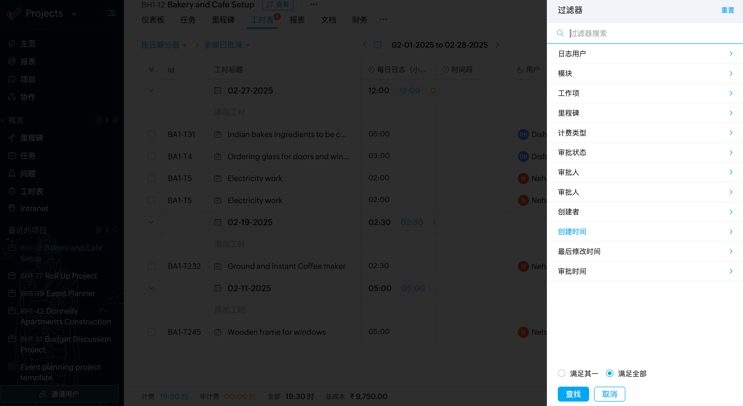 可以过滤工时表以查看符合所选条件的时间记录。单击右上角可查看过滤选项。