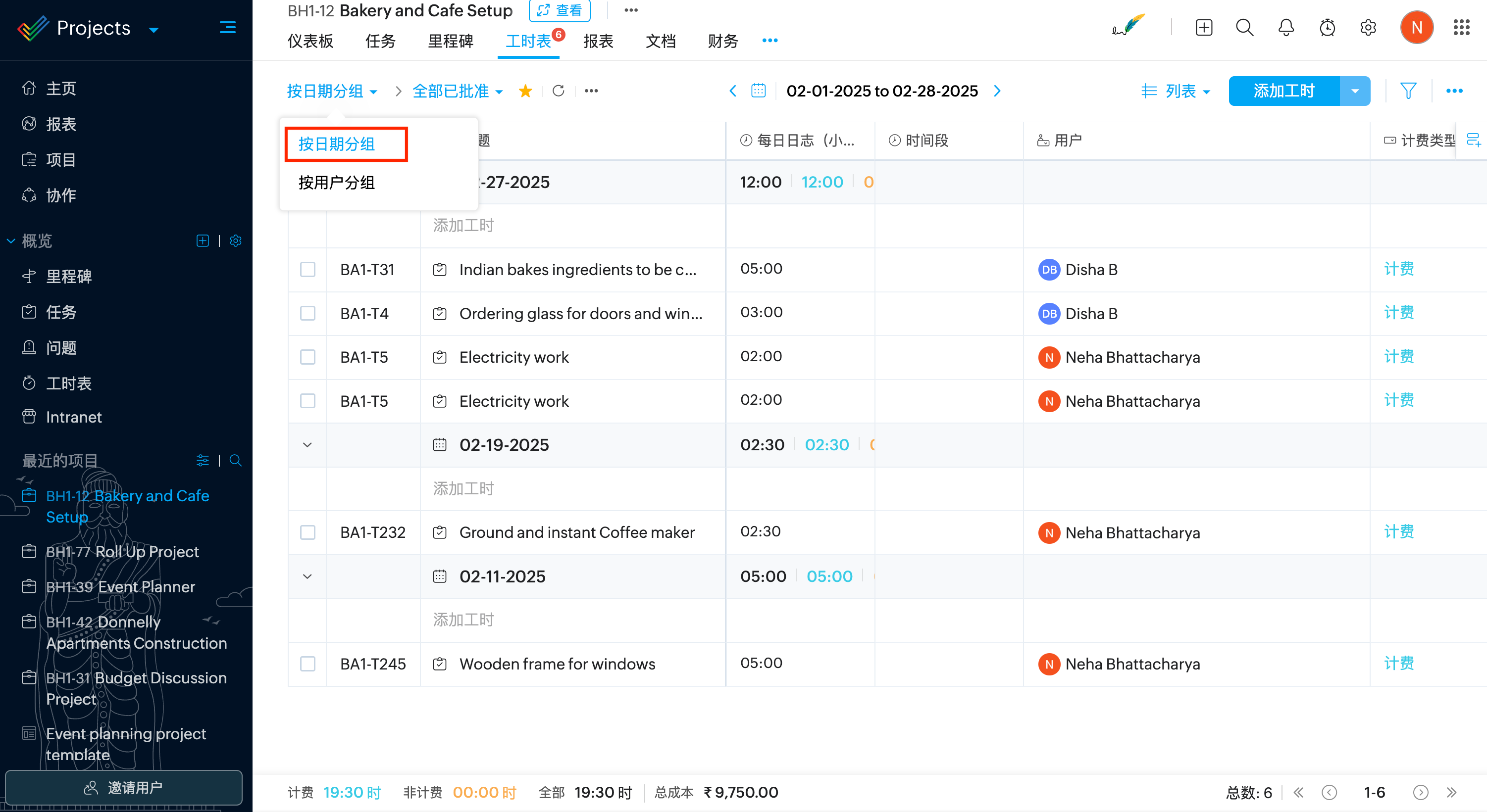 工时表可以按日期或用户分组。此外,可以过滤时间表以查看符合特定条件的数据。