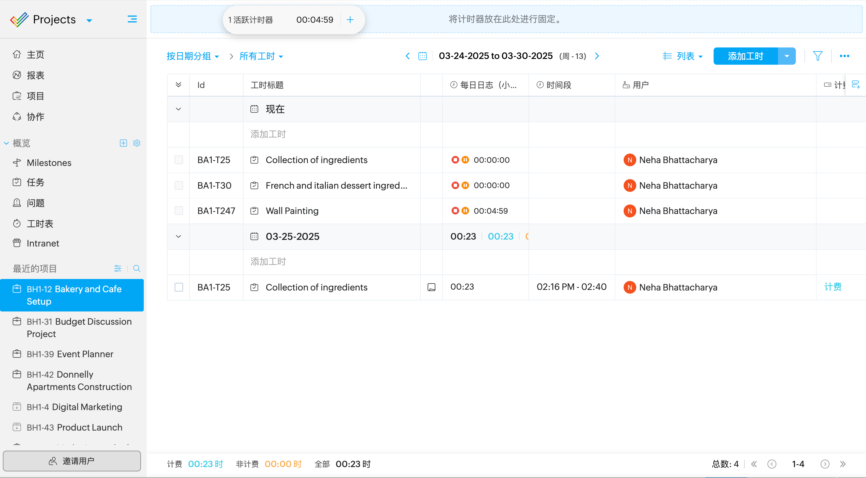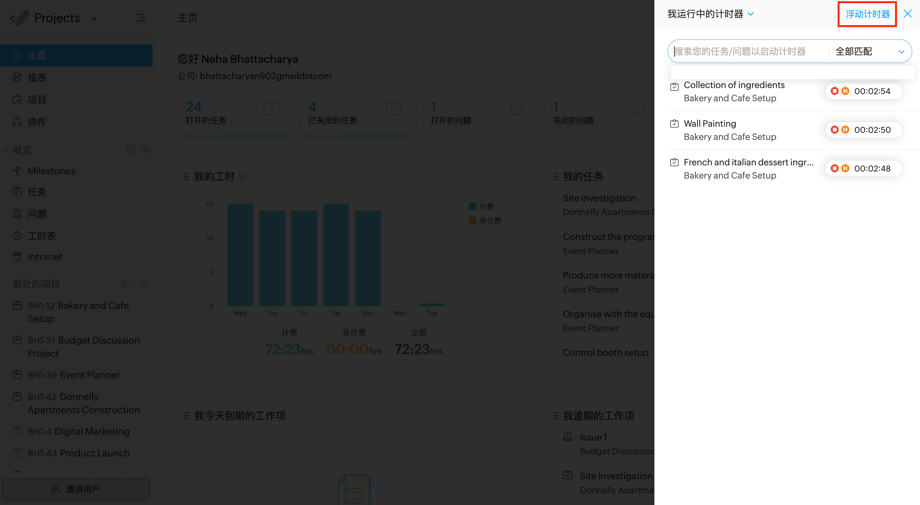 计时器在屏幕上移动,并始终在 Zoho Projects 窗口中可见。