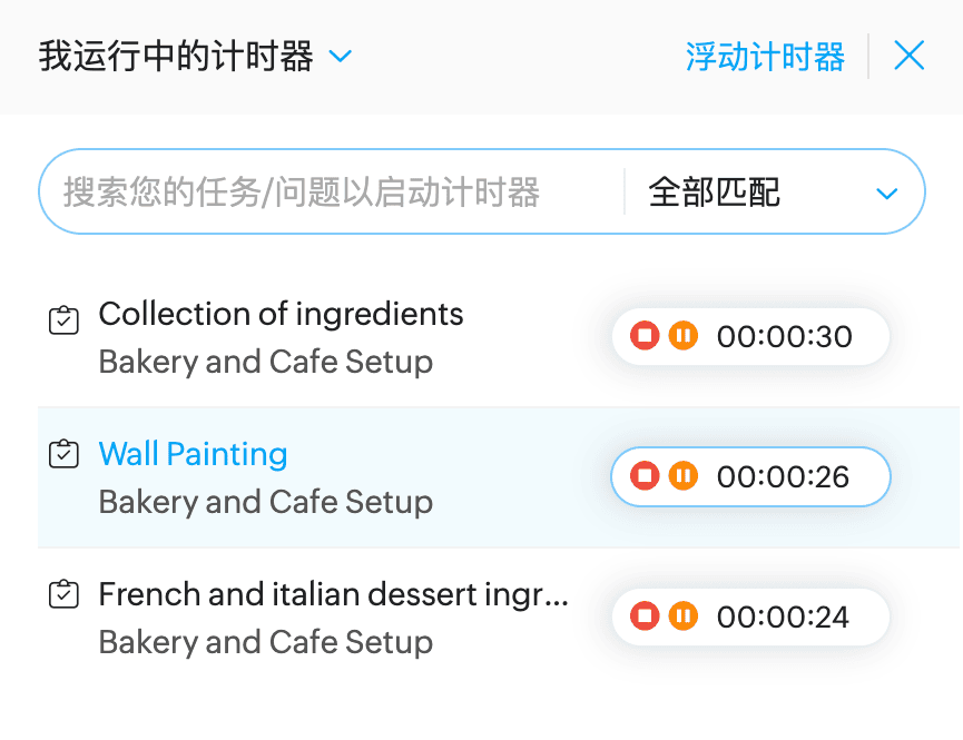 计时器让您可以自动跟踪和记录任务和问题的时间。计时器可以启动、暂停和停止。当用户停止计时器时,日志将更新。可以从 Zoho Projects 中的任何页面访问全局计时器小部件。
