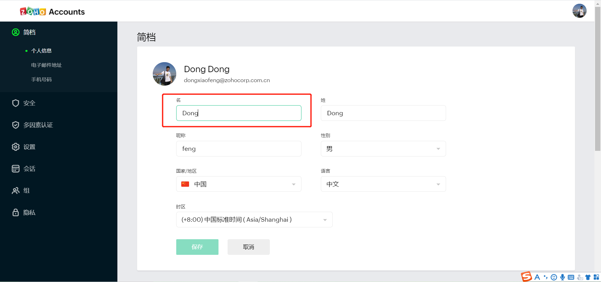 2.在个人信息界面,在“名”中输入自己的名字,“姓”可以为空,设置自己的个人信息。