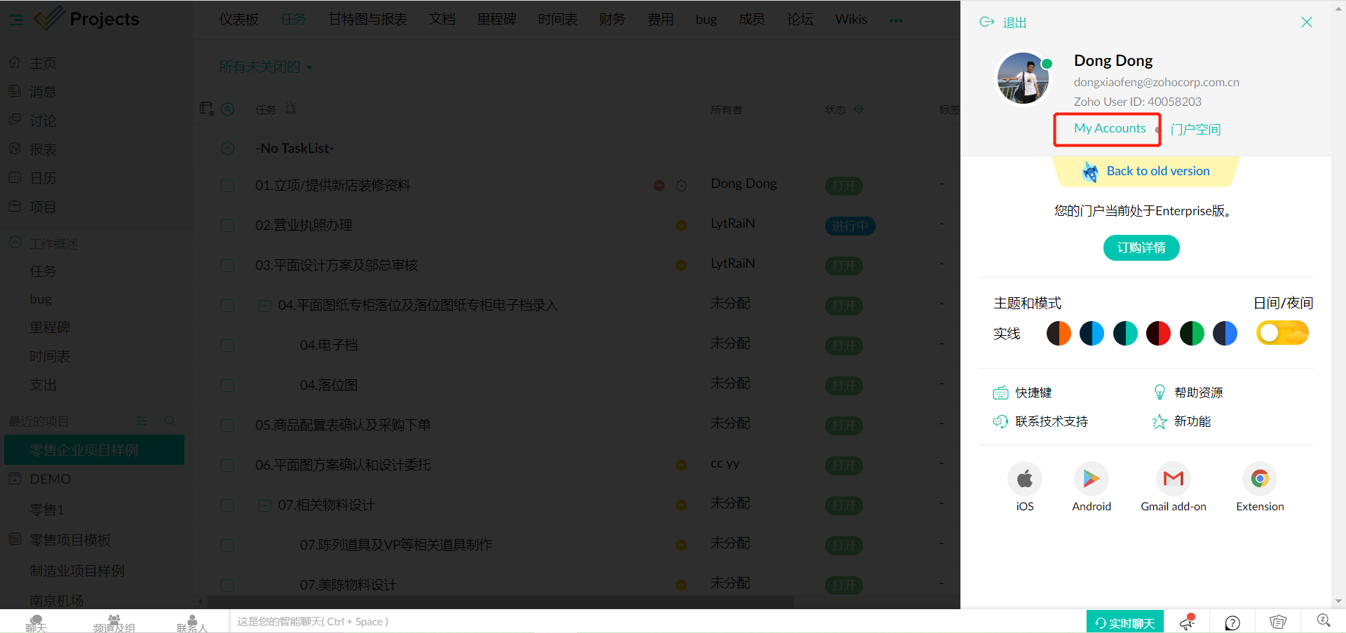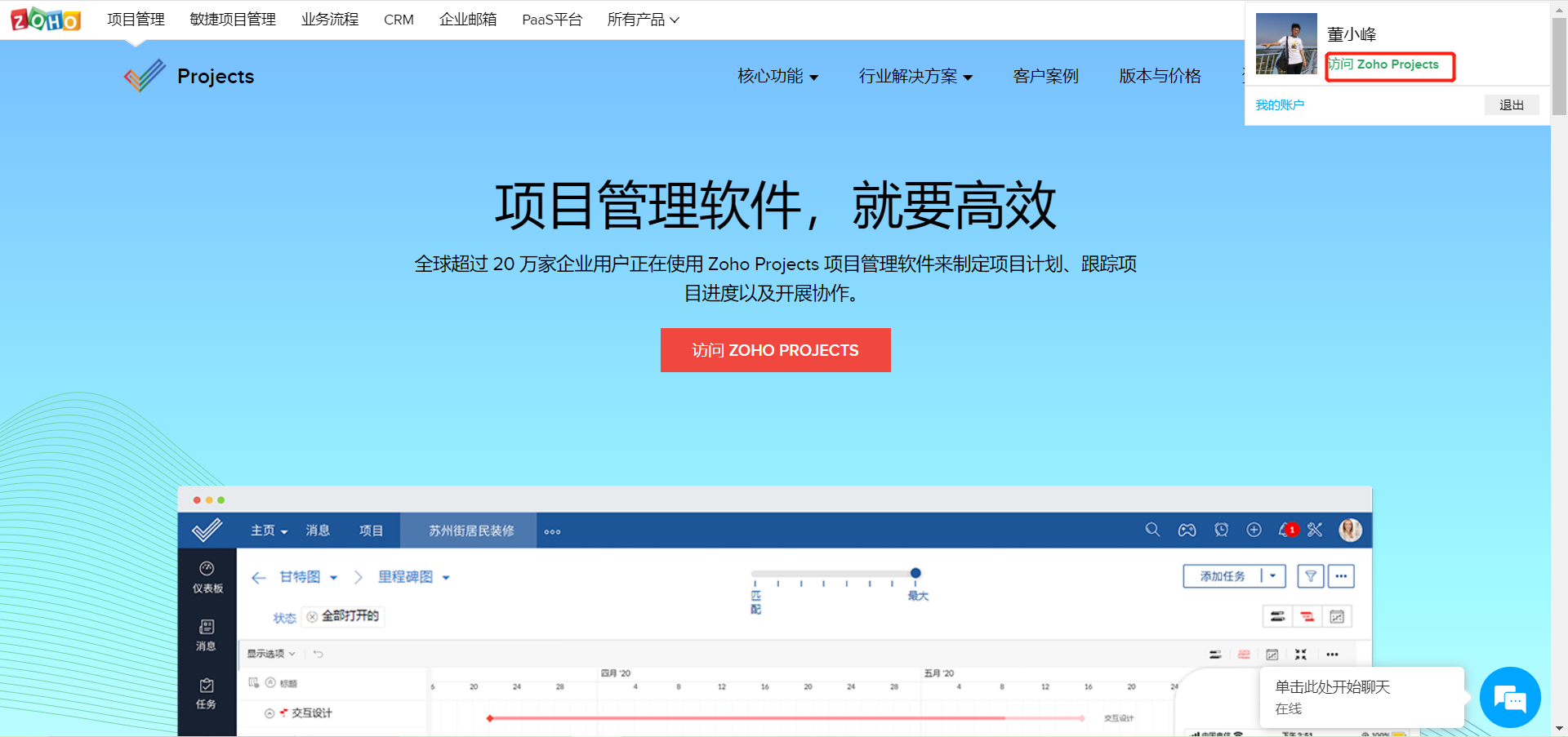 除项目所有者需要在Zoho Projects主页面注册账号,其他成员必须要管理员邀请才可以加入该门户。(如果用户自己在主页创建账号,那么就会创建一个新的门户,进去的并不是公司的门户。)