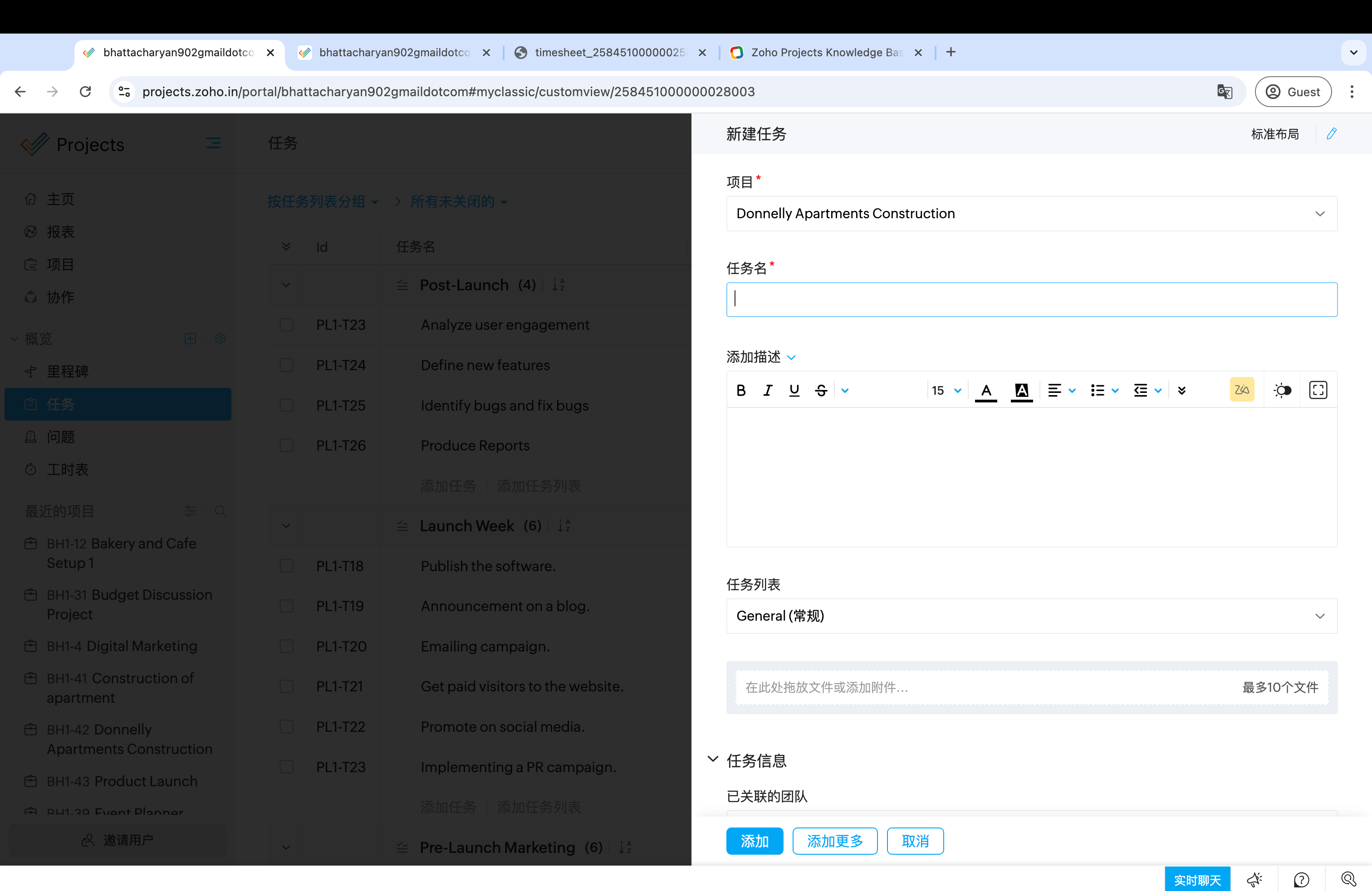 公寓维护:可以使用 Zoho Projects 跟踪维护活动。可以将要执行的任务添加到“任务”下,例如升降机的日常维护、水箱清洁和发电机的维修。