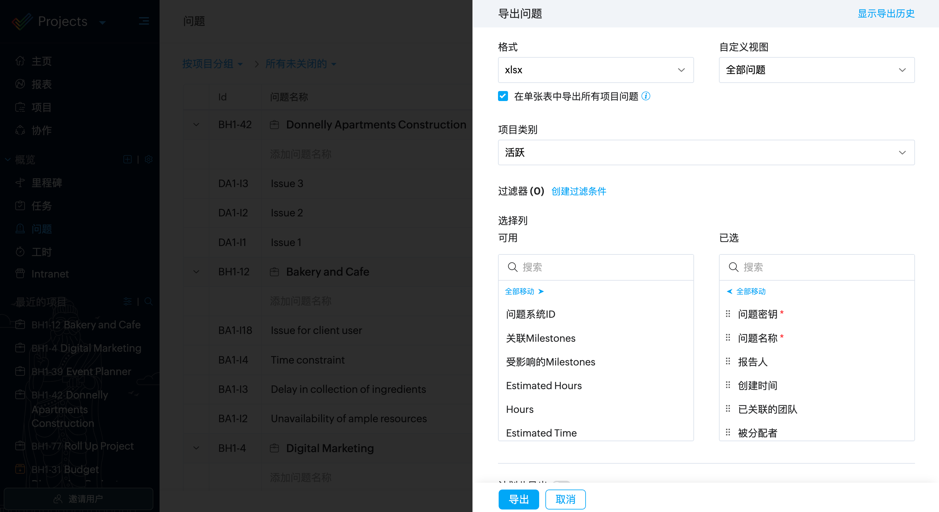 用户还可以从“概览”>“问题”部分导出所有项目的问题。