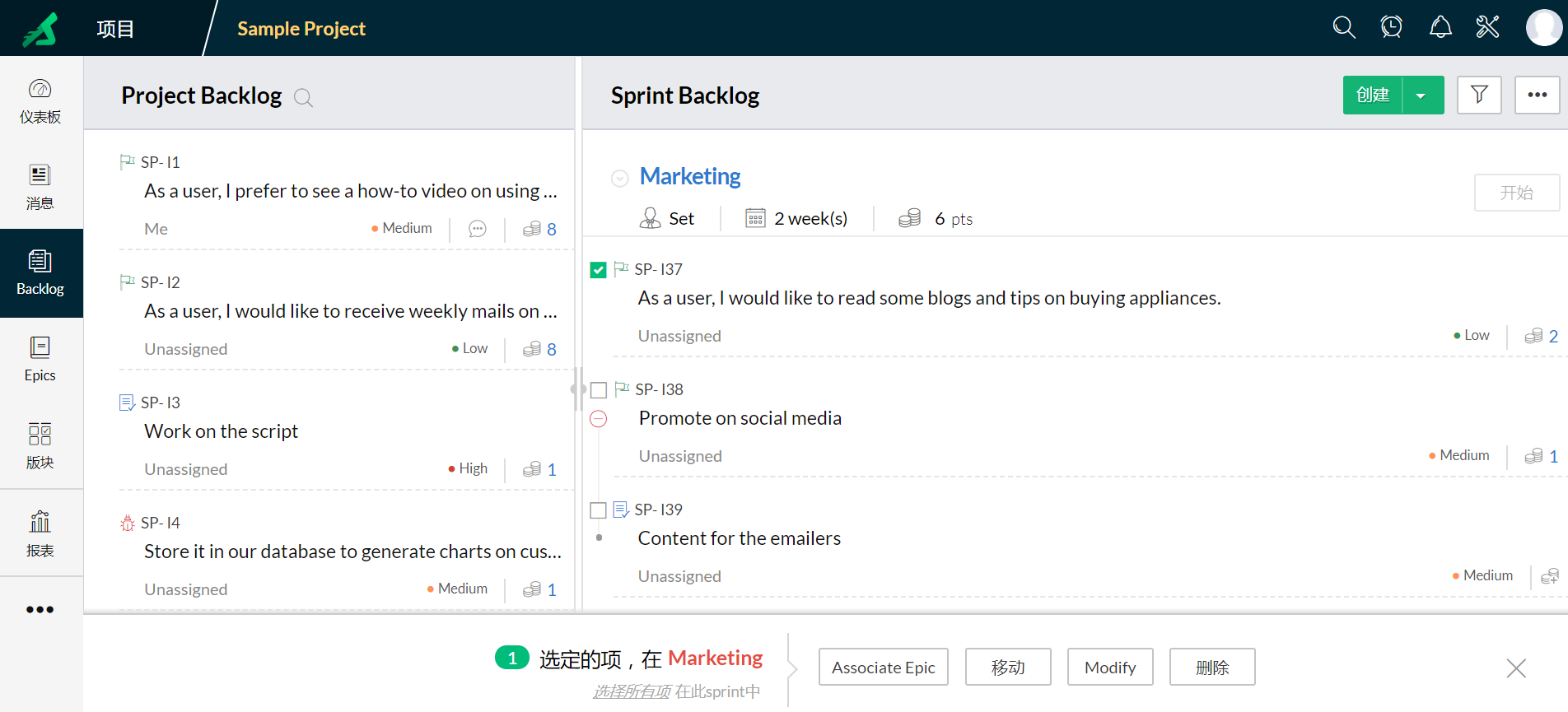 您可以更改项的优先级,或者将积压工作项的分组从积压工作移至 Sprint。