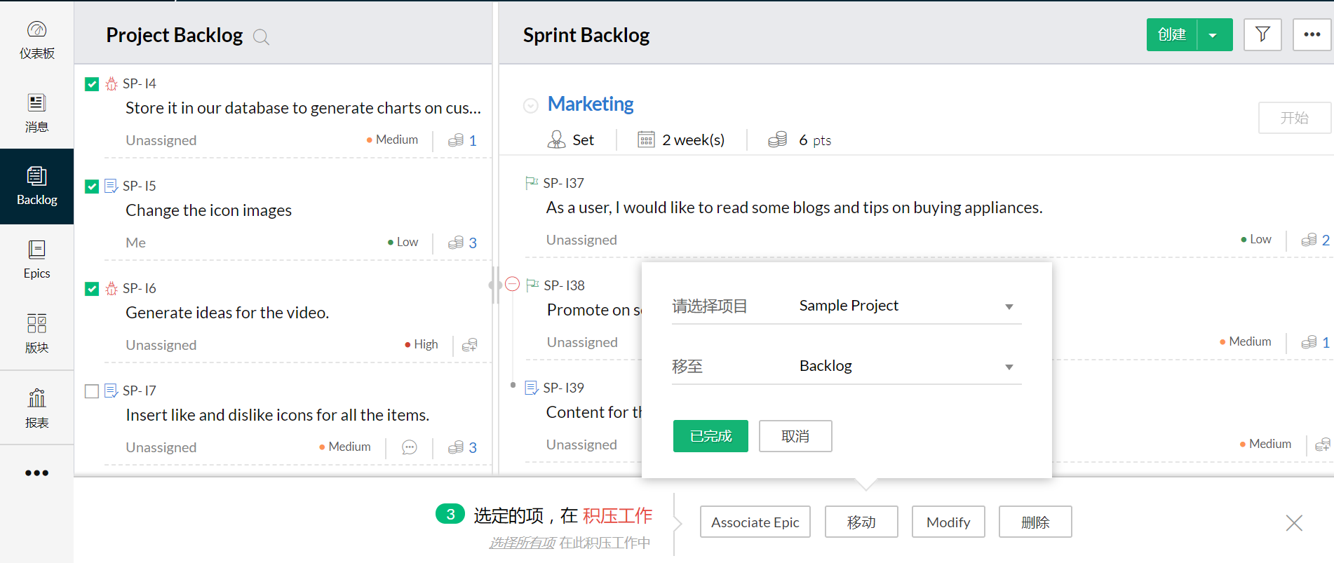 移动(您可以将工作项目移动到积压工作和Sprint)、