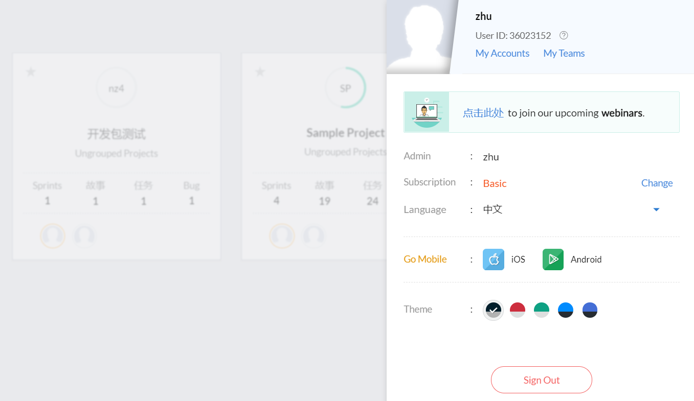 可以从同一个位置管理您的所有简档设置。您的帐户、团队、订购、语言和主题设置都可以在您的简档中完成。