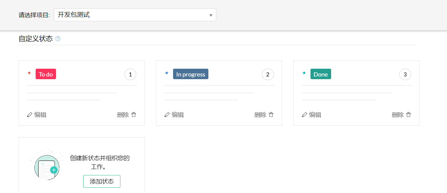 默认情况下,在版面上有三种状态:待办事项、正在进行和完成。除这三种预定义状态以外,您还可以将自定义状态添加到版面中。