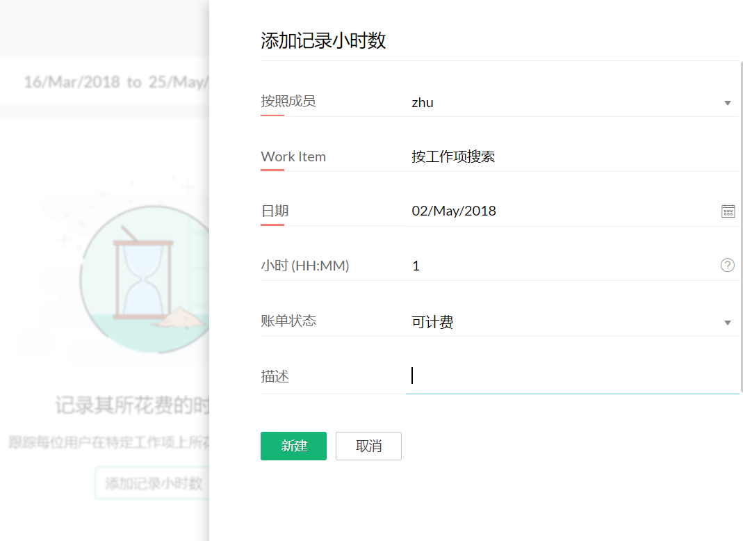 选择用户、工作项、可计费或不可计费以及时间。