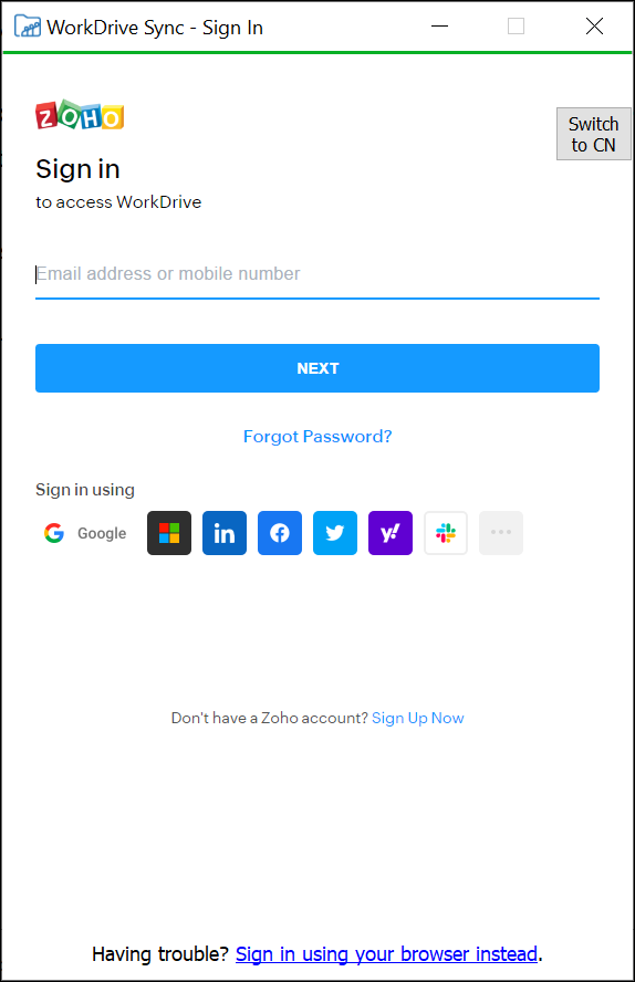 2. 单击登录,然后按照“安装和设置 WorkDrive Sync(适用于 Windows)”中所述的步骤操作。